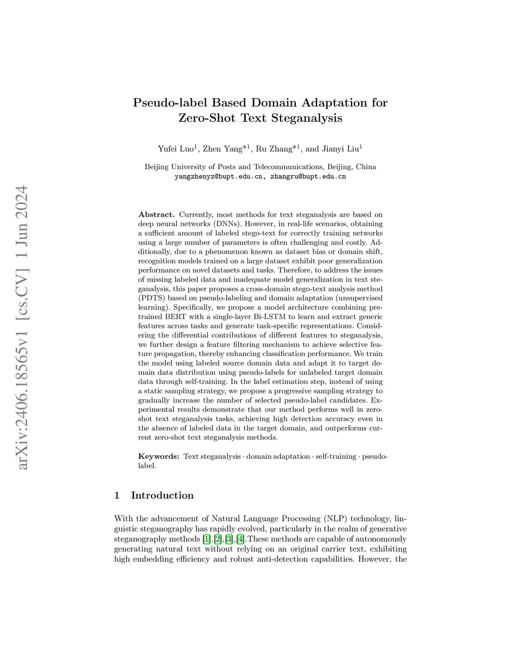 Currently, most methods for text steganalysis are based on deep neural networks (DNNs). However, in real-life scenarios, obtaining a sufficient amount of labeled stego-text for correctly training networks using a large number of parameters is often challenging and costly. Additionally, due to a phenomenon known as dataset bias or domain shift, recognition models trained on a large dataset exhibit poor generalization performance on novel datasets and tasks. Therefore, to address the issues of missing labeled data and inadequate model generalization in text steganalysis, this paper proposes a cross-domain stego-text analysis method (PDTS) based on pseudo-labeling and domain adaptation (unsupervised learning). Specifically, we propose a model architecture combining pre-trained BERT with a single-layer Bi-LSTM to learn and extract generic features across tasks and generate task-specific representations. Considering the differential contributions of different features to steganalysis, we further design a feature filtering mechanism to achieve selective feature propagation, thereby enhancing classification performance. We train the model using labeled source domain data and adapt it to target domain data distribution using pseudo-labels for unlabeled target domain data through self-training. In the label estimation step, instead of using a static sampling strategy, we propose a progressive sampling strategy to gradually increase the number of selected pseudo-label candidates. Experimental results demonstrate that our method performs well in zero-shot text steganalysis tasks, achieving high detection accuracy even in the absence of labeled data in the target domain, and outperforms current zero-shot text steganalysis methods.