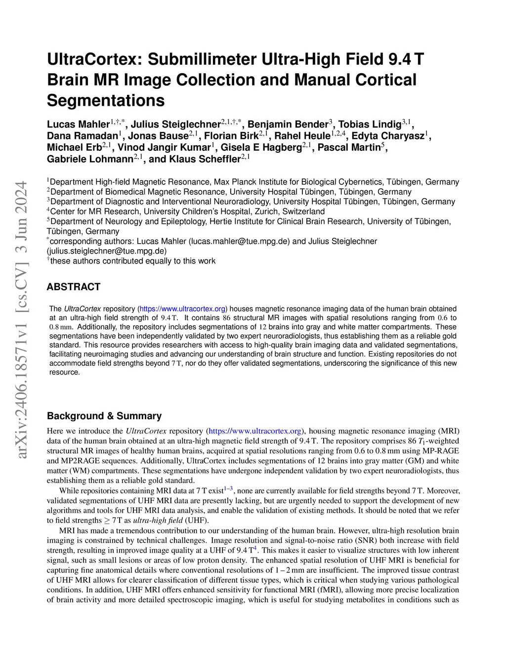 UltraCortex: Submillimeter Ultra-High Field 9.4 T Brain MR Image Collection and Manual Cortical Segmentations