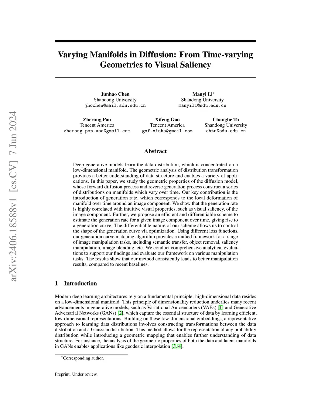 Deep generative models learn the data distribution, which is concentrated on a low-dimensional manifold. The geometric analysis of distribution transformation provides a better understanding of data structure and enables a variety of applications. In this paper, we study the geometric properties of the diffusion model, whose forward diffusion process and reverse generation process construct a series of distributions on manifolds which vary over time. Our key contribution is the introduction of generation rate, which corresponds to the local deformation of manifold over time around an image component. We show that the generation rate is highly correlated with intuitive visual properties, such as visual saliency, of the image component. Further, we propose an efficient and differentiable scheme to estimate the generation rate for a given image component over time, giving rise to a generation curve. The differentiable nature of our scheme allows us to control the shape of the generation curve via optimization. Using different loss functions, our generation curve matching algorithm provides a unified framework for a range of image manipulation tasks, including semantic transfer, object removal, saliency manipulation, image blending, etc. We conduct comprehensive analytical evaluations to support our findings and evaluate our framework on various manipulation tasks. The results show that our method consistently leads to better manipulation results, compared to recent baselines.