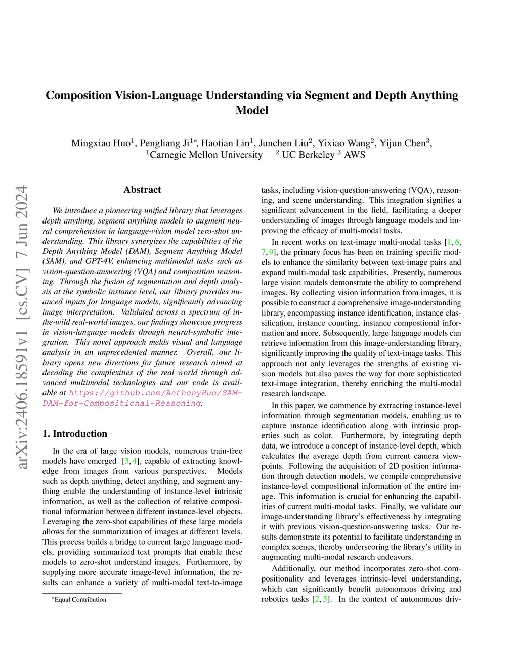 We introduce a pioneering unified library that leverages depth anything, segment anything models to augment neural comprehension in language-vision model zero-shot understanding. This library synergizes the capabilities of the Depth Anything Model (DAM), Segment Anything Model (SAM), and GPT-4V, enhancing multimodal tasks such as vision-question-answering (VQA) and composition reasoning. Through the fusion of segmentation and depth analysis at the symbolic instance level, our library provides nuanced inputs for language models, significantly advancing image interpretation. Validated across a spectrum of in-the-wild real-world images, our findings showcase progress in vision-language models through neural-symbolic integration. This novel approach melds visual and language analysis in an unprecedented manner. Overall, our library opens new directions for future research aimed at decoding the complexities of the real world through advanced multimodal technologies and our code is available at \url{https://github.com/AnthonyHuo/SAM-DAM-for-Compositional-Reasoning}.