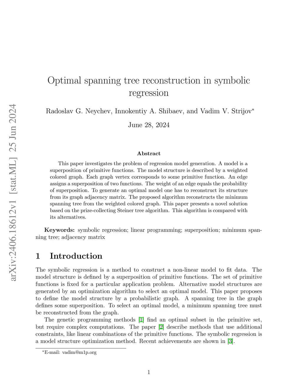 This paper investigates the problem of regression model generation. A model is a superposition of primitive functions. The model structure is described by a weighted colored graph. Each graph vertex corresponds to some primitive function. An edge assigns a superposition of two functions. The weight of an edge equals the probability of superposition. To generate an optimal model one has to reconstruct its structure from its graph adjacency matrix. The proposed algorithm reconstructs the~minimum spanning tree from the~weighted colored graph. This paper presents a novel solution based on the prize-collecting Steiner tree algorithm. This algorithm is compared with its alternatives.
