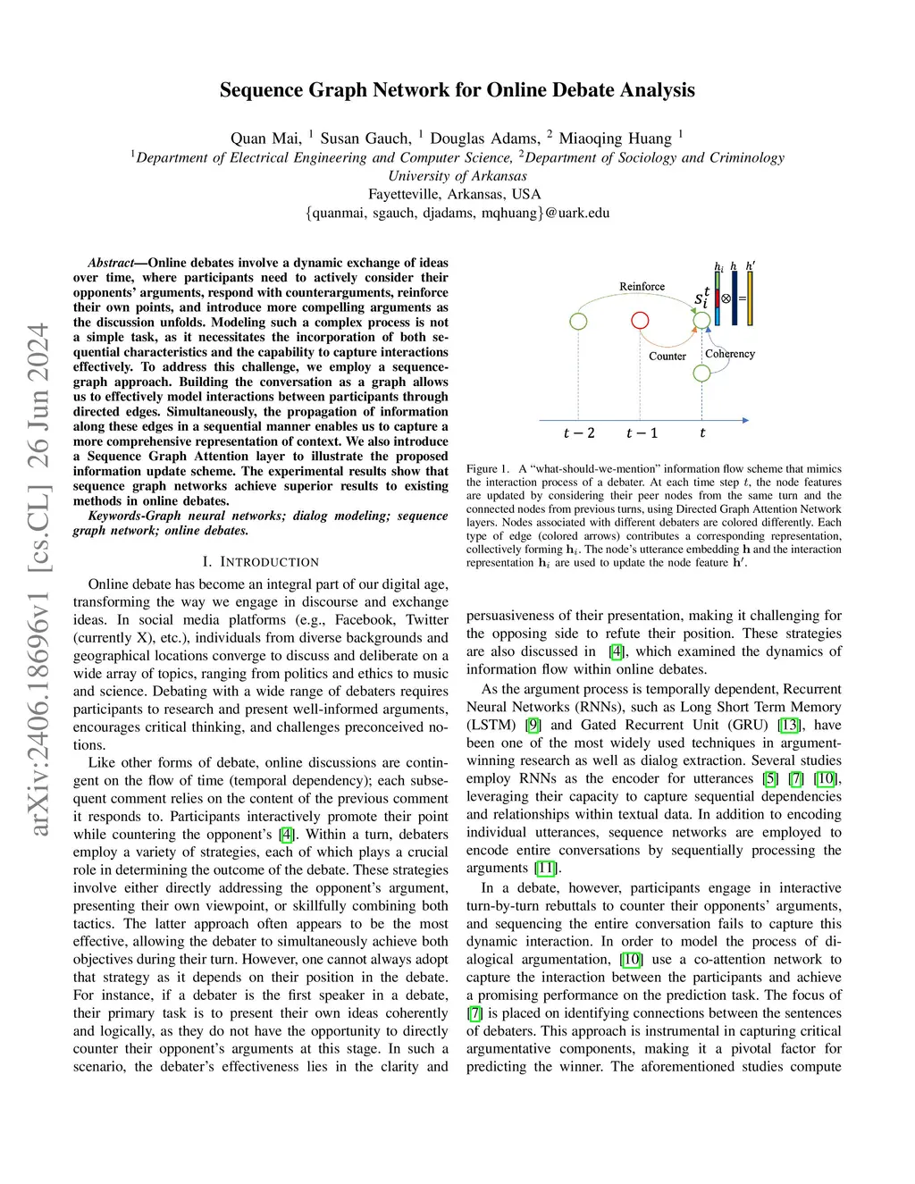 Online debates involve a dynamic exchange of ideas over time, where participants need to actively consider their opponents' arguments, respond with counterarguments, reinforce their own points, and introduce more compelling arguments as the discussion unfolds. Modeling such a complex process is not a simple task, as it necessitates the incorporation of both sequential characteristics and the capability to capture interactions effectively. To address this challenge, we employ a sequence-graph approach. Building the conversation as a graph allows us to effectively model interactions between participants through directed edges. Simultaneously, the propagation of information along these edges in a sequential manner enables us to capture a more comprehensive representation of context. We also introduce a Sequence Graph Attention layer to illustrate the proposed information update scheme. The experimental results show that sequence graph networks achieve superior results to existing methods in online debates.