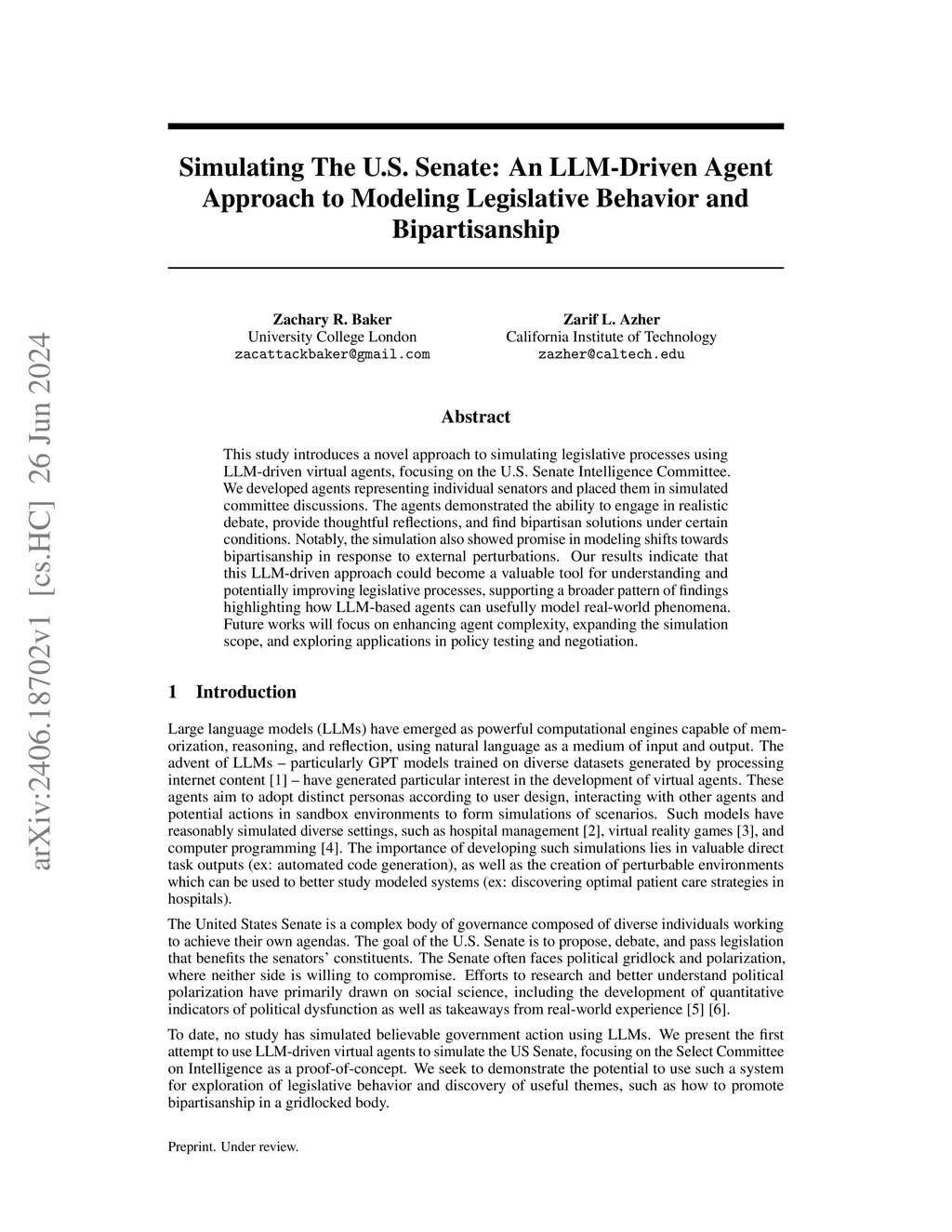 This study introduces a novel approach to simulating legislative processes using LLM-driven virtual agents, focusing on the U.S. Senate Intelligence Committee. We developed agents representing individual senators and placed them in simulated committee discussions. The agents demonstrated the ability to engage in realistic debate, provide thoughtful reflections, and find bipartisan solutions under certain conditions. Notably, the simulation also showed promise in modeling shifts towards bipartisanship in response to external perturbations. Our results indicate that this LLM-driven approach could become a valuable tool for understanding and potentially improving legislative processes, supporting a broader pattern of findings highlighting how LLM-based agents can usefully model real-world phenomena. Future works will focus on enhancing agent complexity, expanding the simulation scope, and exploring applications in policy testing and negotiation.