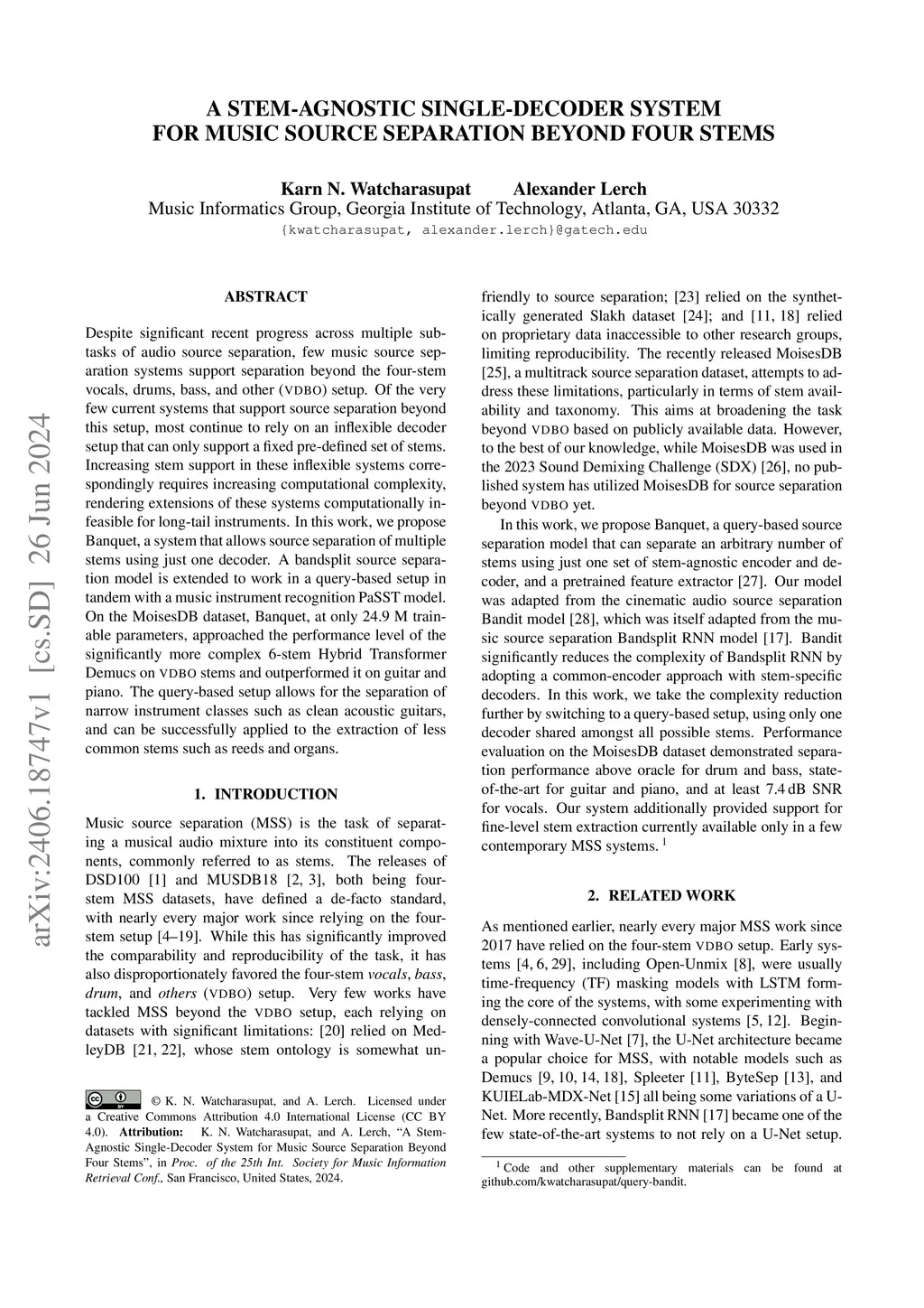 Despite significant recent progress across multiple subtasks of audio source separation, few music source separation systems support separation beyond the four-stem vocals, drums, bass, and other (VDBO) setup. Of the very few current systems that support source separation beyond this setup, most continue to rely on an inflexible decoder setup that can only support a fixed pre-defined set of stems. Increasing stem support in these inflexible systems correspondingly requires increasing computational complexity, rendering extensions of these systems computationally infeasible for long-tail instruments. In this work, we propose Banquet, a system that allows source separation of multiple stems using just one decoder. A bandsplit source separation model is extended to work in a query-based setup in tandem with a music instrument recognition PaSST model. On the MoisesDB dataset, Banquet, at only 24.9 M trainable parameters, approached the performance level of the significantly more complex 6-stem Hybrid Transformer Demucs on VDBO stems and outperformed it on guitar and piano. The query-based setup allows for the separation of narrow instrument classes such as clean acoustic guitars, and can be successfully applied to the extraction of less common stems such as reeds and organs. Implementation is available at https://github.com/kwatcharasupat/query-bandit.