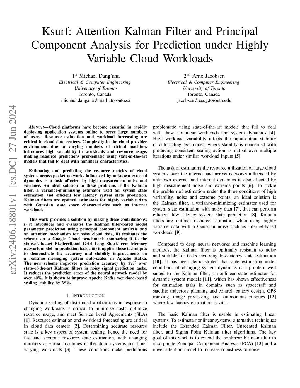 Cloud platforms have become essential in rapidly deploying application systems online to serve large numbers of users. Resource estimation and workload forecasting are critical in cloud data centers. Complexity in the cloud provider environment due to varying numbers of virtual machines introduces high variability in workloads and resource usage, making resource predictions problematic using state-of-the-art models that fail to deal with nonlinear characteristics. Estimating and predicting the resource metrics of cloud systems across packet networks influenced by unknown external dynamics is a task affected by high measurement noise and variance. An ideal solution to these problems is the Kalman filter, a variance-minimizing estimator used for system state estimation and efficient low latency system state prediction. Kalman filters are optimal estimators for highly variable data with Gaussian state space characteristics such as internet workloads. This work provides a solution by making these contributions: i) it introduces and evaluates the Kalman filter-based model parameter prediction using principal component analysis and an attention mechanism for noisy cloud data, ii) evaluates the scheme on a Google Cloud benchmark comparing it to the state-of-the-art Bi-directional Grid Long Short-Term Memory network model on prediction tasks, iii) it applies these techniques to demonstrate the accuracy and stability improvements on a realtime messaging system auto-scaler in Apache Kafka. The new scheme improves prediction accuracy by over state-of-the-art Kalman filters in noisy signal prediction tasks. It reduces the prediction error of the neural network model by over . It is shown to improve Apache Kafka workload-based scaling stability by .