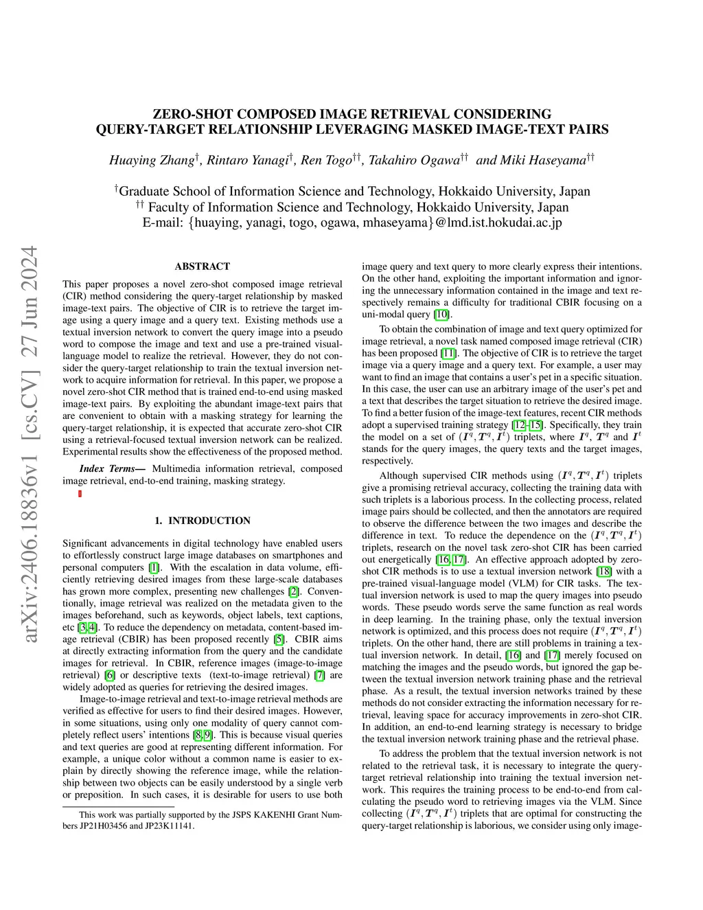 This paper proposes a novel zero-shot composed image retrieval (CIR) method considering the query-target relationship by masked image-text pairs. The objective of CIR is to retrieve the target image using a query image and a query text. Existing methods use a textual inversion network to convert the query image into a pseudo word to compose the image and text and use a pre-trained visual-language model to realize the retrieval. However, they do not consider the query-target relationship to train the textual inversion network to acquire information for retrieval. In this paper, we propose a novel zero-shot CIR method that is trained end-to-end using masked image-text pairs. By exploiting the abundant image-text pairs that are convenient to obtain with a masking strategy for learning the query-target relationship, it is expected that accurate zero-shot CIR using a retrieval-focused textual inversion network can be realized. Experimental results show the effectiveness of the proposed method.