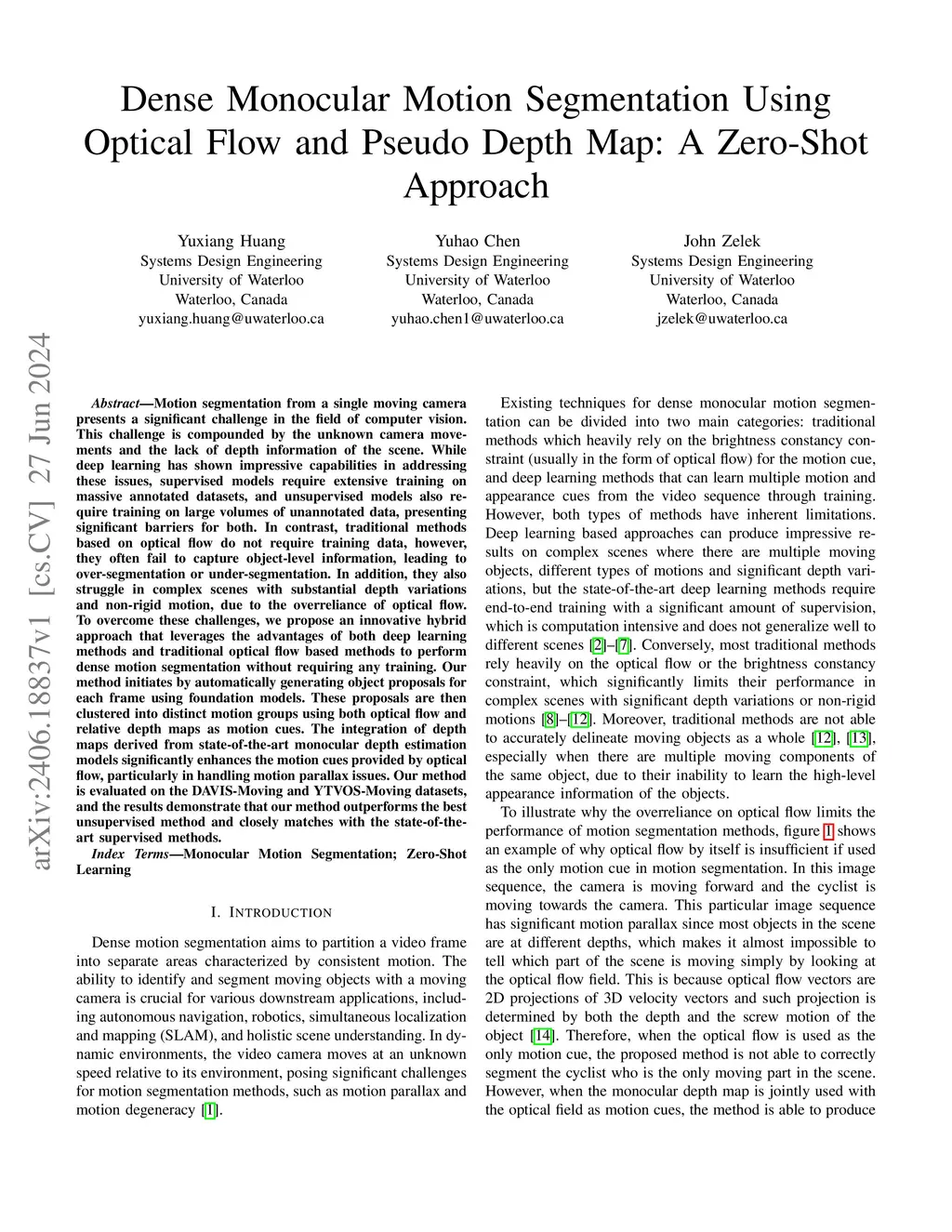 Dense Monocular Motion Segmentation Using Optical Flow and Pseudo Depth