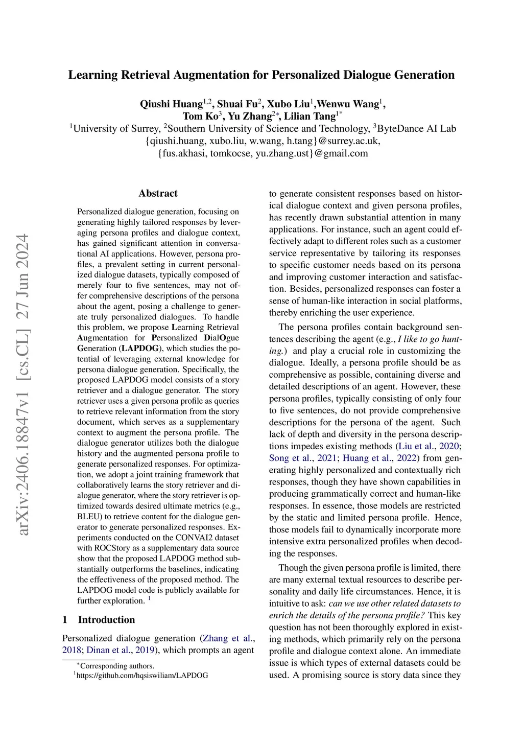Personalized dialogue generation, focusing on generating highly tailored responses by leveraging persona profiles and dialogue context, has gained significant attention in conversational AI applications. However, persona profiles, a prevalent setting in current personalized dialogue datasets, typically composed of merely four to five sentences, may not offer comprehensive descriptions of the persona about the agent, posing a challenge to generate truly personalized dialogues. To handle this problem, we propose earning Retrieval ugmentation for ersonalized ialgue eneration (), which studies the potential of leveraging external knowledge for persona dialogue generation. Specifically, the proposed LAPDOG model consists of a story retriever and a dialogue generator. The story retriever uses a given persona profile as queries to retrieve relevant information from the story document, which serves as a supplementary context to augment the persona profile. The dialogue generator utilizes both the dialogue history and the augmented persona profile to generate personalized responses. For optimization, we adopt a joint training framework that collaboratively learns the story retriever and dialogue generator, where the story retriever is optimized towards desired ultimate metrics (e.g., BLEU) to retrieve content for the dialogue generator to generate personalized responses. Experiments conducted on the CONVAI2 dataset with ROCStory as a supplementary data source show that the proposed LAPDOG method substantially outperforms the baselines, indicating the effectiveness of the proposed method. The LAPDOG model code is publicly available for further exploration. https://github.com/hqsiswiliam/LAPDOG