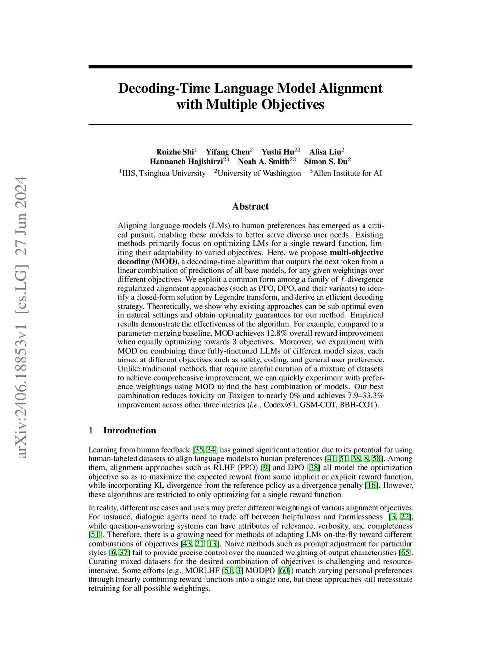 Aligning language models (LMs) to human preferences has emerged as a critical pursuit, enabling these models to better serve diverse user needs. Existing methods primarily focus on optimizing LMs for a single reward function, limiting their adaptability to varied objectives. Here, we propose , a decoding-time algorithm that outputs the next token from a linear combination of predictions of all base models, for any given weightings over different objectives. We exploit a common form among a family of -divergence regularized alignment approaches (such as PPO, DPO, and their variants) to identify a closed-form solution by Legendre transform, and derive an efficient decoding strategy. Theoretically, we show why existing approaches can be sub-optimal even in natural settings and obtain optimality guarantees for our method. Empirical results demonstrate the effectiveness of the algorithm. For example, compared to a parameter-merging baseline, MOD achieves 12.8% overall reward improvement when equally optimizing towards objectives. Moreover, we experiment with MOD on combining three fully-finetuned LLMs of different model sizes, each aimed at different objectives such as safety, coding, and general user preference. Unlike traditional methods that require careful curation of a mixture of datasets to achieve comprehensive improvement, we can quickly experiment with preference weightings using MOD to find the best combination of models. Our best combination reduces toxicity on Toxigen to nearly 0% and achieves 7.9--33.3% improvement across other three metrics (, Codex@1, GSM-COT, BBH-COT).