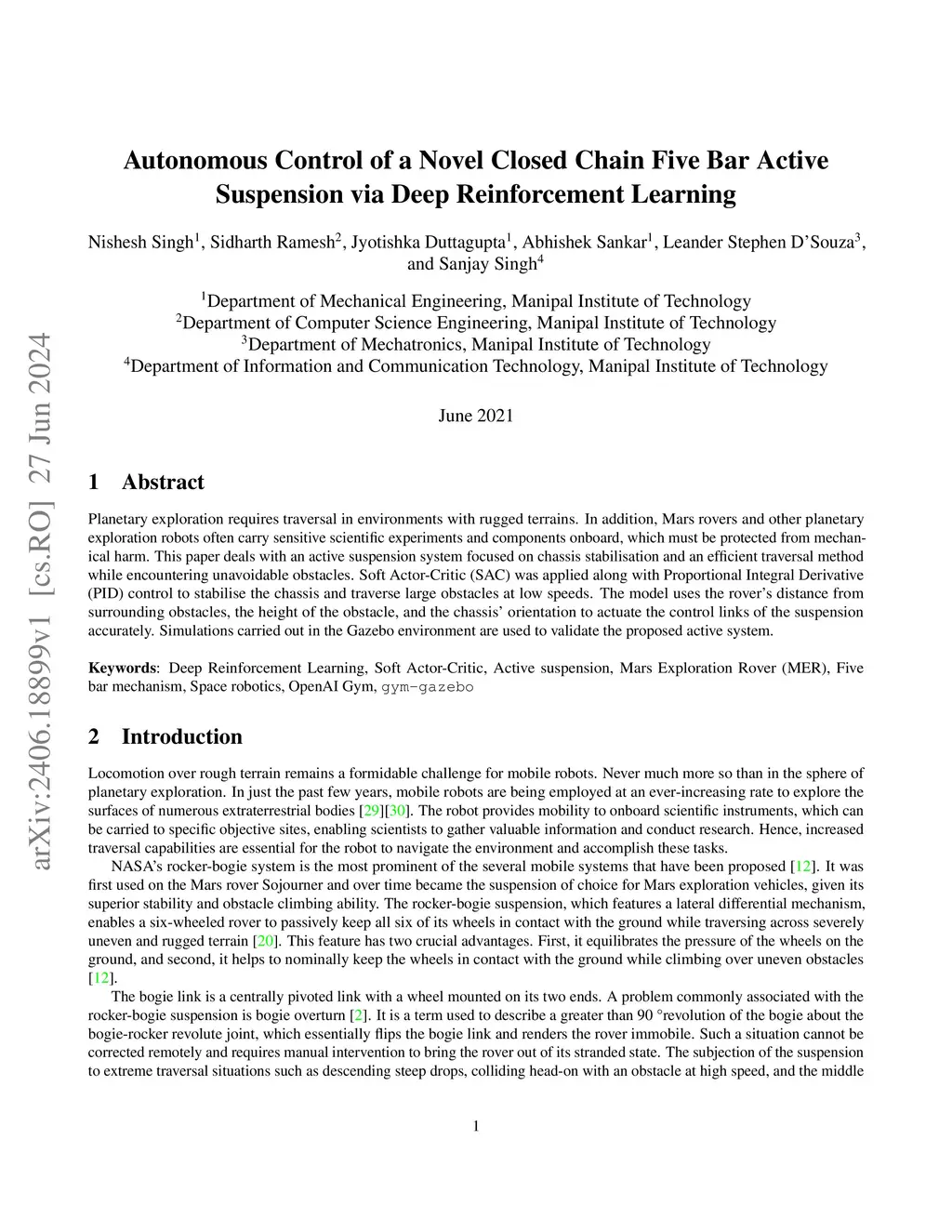 Planetary exploration requires traversal in environments with rugged terrains. In addition, Mars rovers and other planetary exploration robots often carry sensitive scientific experiments and components onboard, which must be protected from mechanical harm. This paper deals with an active suspension system focused on chassis stabilisation and an efficient traversal method while encountering unavoidable obstacles. Soft Actor-Critic (SAC) was applied along with Proportional Integral Derivative (PID) control to stabilise the chassis and traverse large obstacles at low speeds. The model uses the rover's distance from surrounding obstacles, the height of the obstacle, and the chassis' orientation to actuate the control links of the suspension accurately. Simulations carried out in the Gazebo environment are used to validate the proposed active system.