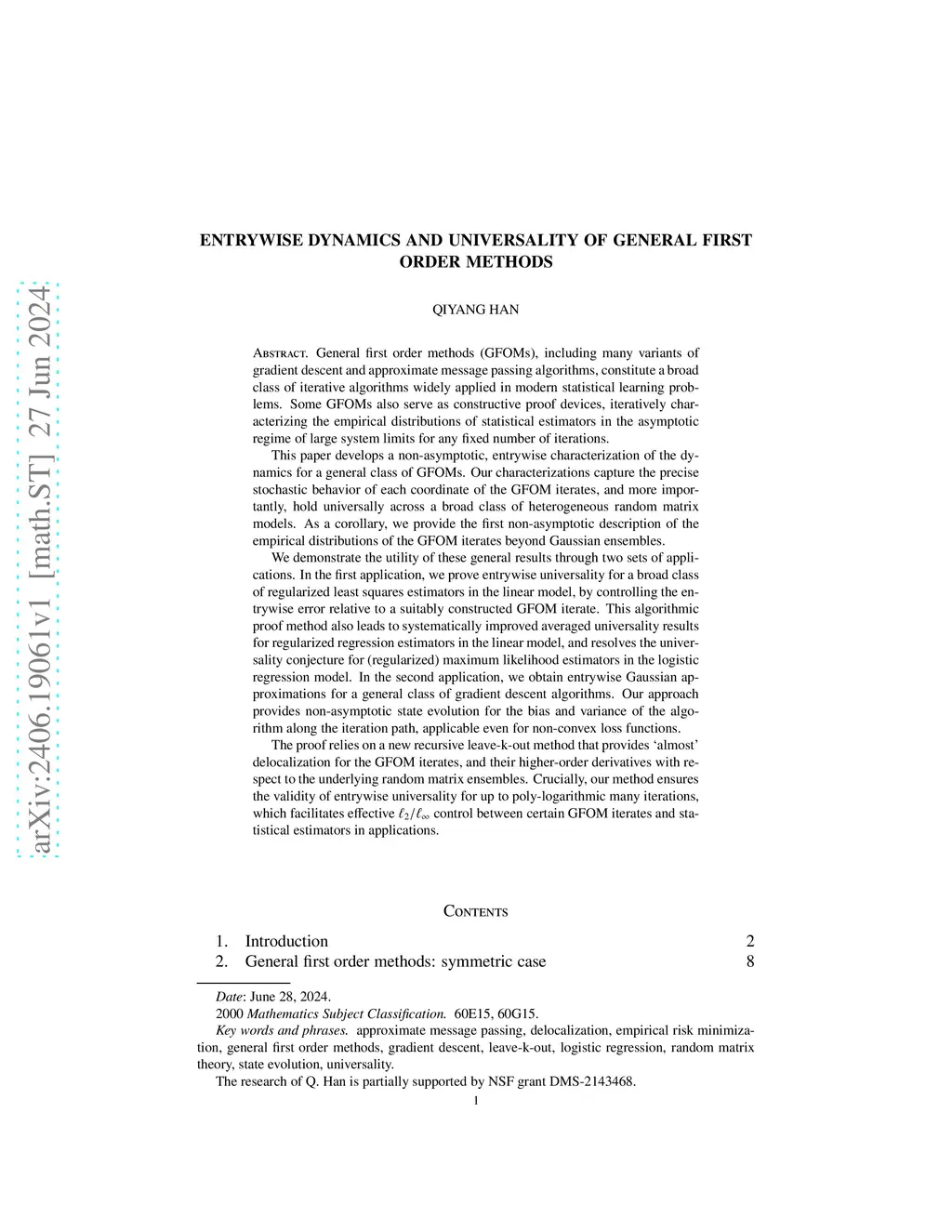 General first order methods (GFOMs), including various gradient descent and AMP algorithms, constitute a broad class of iterative algorithms in modern statistical learning problems. Some GFOMs also serve as constructive proof devices, iteratively characterizing the empirical distributions of statistical estimators in the large system limits for any fixed number of iterations. This paper develops a non-asymptotic, entrywise characterization for a general class of GFOMs. Our characterizations capture the precise entrywise behavior of the GFOMs, and hold universally across a broad class of heterogeneous random matrix models. As a corollary, we provide the first non-asymptotic description of the empirical distributions of the GFOMs beyond Gaussian ensembles. We demonstrate the utility of these general results in two applications. In the first application, we prove entrywise universality for regularized least squares estimators in the linear model, by controlling the entrywise error relative to a suitably constructed GFOM. This algorithmic proof method also leads to systematically improved averaged universality results for regularized regression estimators in the linear model, and resolves the universality conjecture for (regularized) MLEs in logistic regression. In the second application, we obtain entrywise Gaussian approximations for a class of gradient descent algorithms. Our approach provides non-asymptotic state evolution for the bias and variance of the algorithm along the iteration path, applicable for non-convex loss functions. The proof relies on a new recursive leave-k-out method that provides almost delocalization for the GFOMs and their derivatives. Crucially, our method ensures entrywise universality for up to poly-logarithmic many iterations, which facilitates effective control between certain GFOMs and statistical estimators in applications.