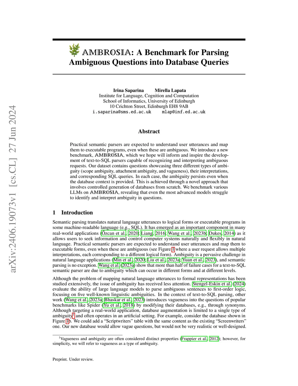 AMBROSIA: A Benchmark for Parsing Ambiguous Questions into Database