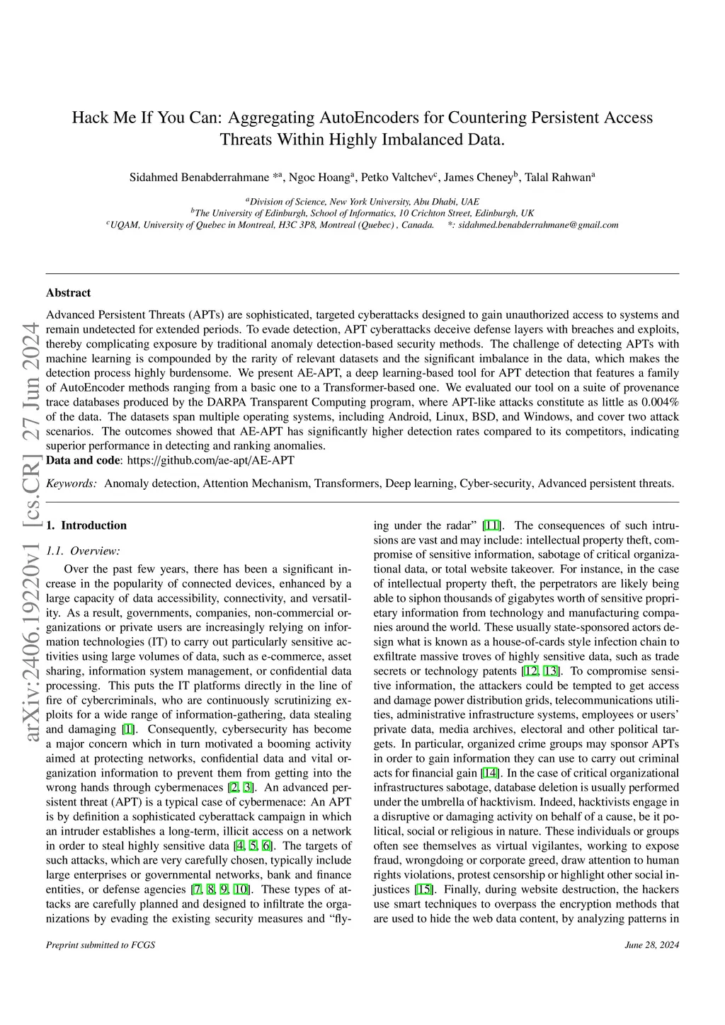 Advanced Persistent Threats (APTs) are sophisticated, targeted cyberattacks designed to gain unauthorized access to systems and remain undetected for extended periods. To evade detection, APT cyberattacks deceive defense layers with breaches and exploits, thereby complicating exposure by traditional anomaly detection-based security methods. The challenge of detecting APTs with machine learning is compounded by the rarity of relevant datasets and the significant imbalance in the data, which makes the detection process highly burdensome. We present AE-APT, a deep learning-based tool for APT detection that features a family of AutoEncoder methods ranging from a basic one to a Transformer-based one. We evaluated our tool on a suite of provenance trace databases produced by the DARPA Transparent Computing program, where APT-like attacks constitute as little as 0.004% of the data. The datasets span multiple operating systems, including Android, Linux, BSD, and Windows, and cover two attack scenarios. The outcomes showed that AE-APT has significantly higher detection rates compared to its competitors, indicating superior performance in detecting and ranking anomalies.