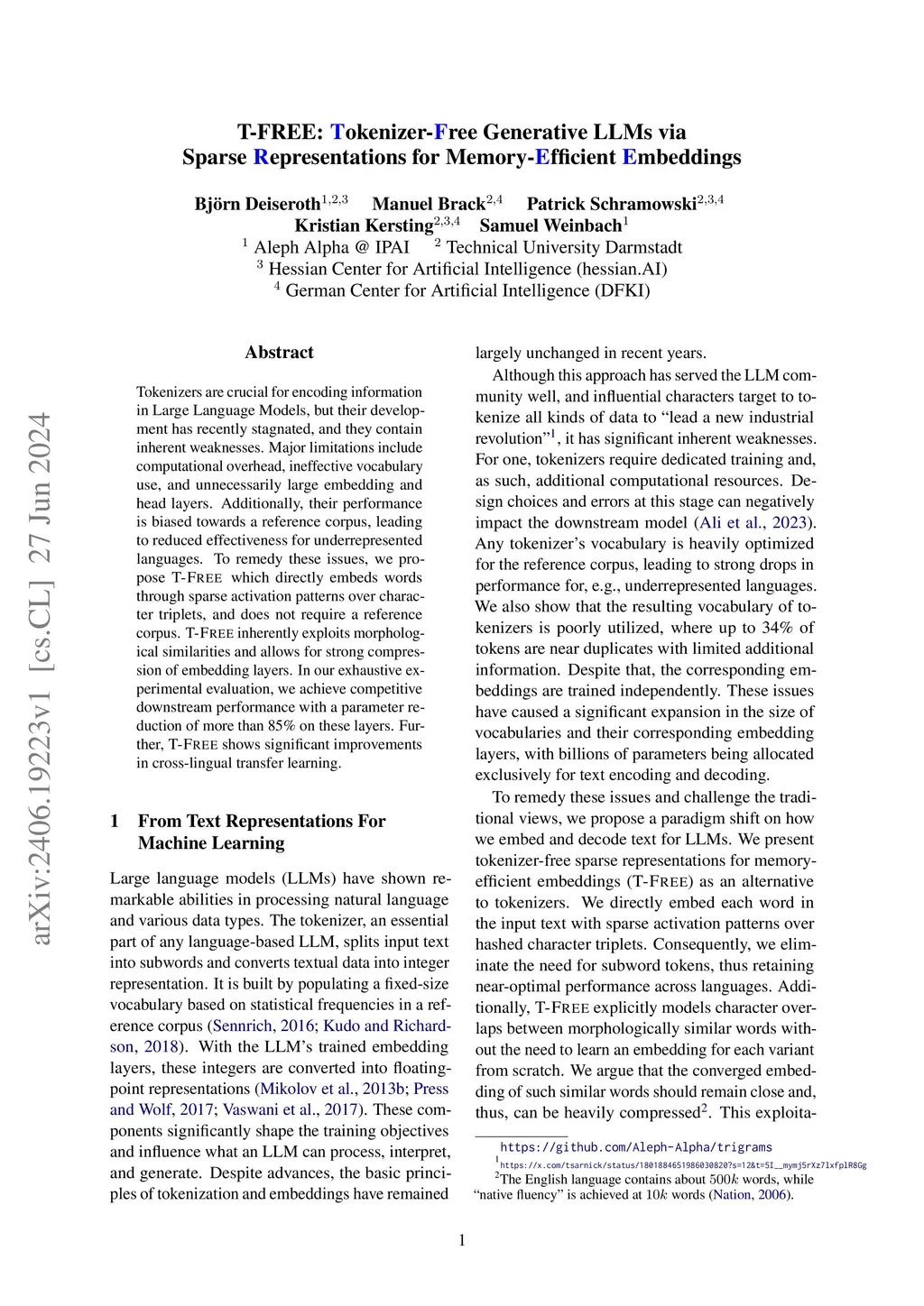 Tokenizers are crucial for encoding information in Large Language Models, but their development has recently stagnated, and they contain inherent weaknesses. Major limitations include computational overhead, ineffective vocabulary use, and unnecessarily large embedding and head layers. Additionally, their performance is biased towards a reference corpus, leading to reduced effectiveness for underrepresented languages.To remedy these issues, we propose T-FREE, which directly embeds words through sparse activation patterns over character triplets, and does not require a reference corpus. T-FREE inherently exploits morphological similarities and allows for strong compression of embedding layers. In our exhaustive experimental evaluation, we achieve competitive downstream performance with a parameter reduction of more than 85% on these layers. Further, T-FREE shows significant improvements in cross-lingual transfer learning.