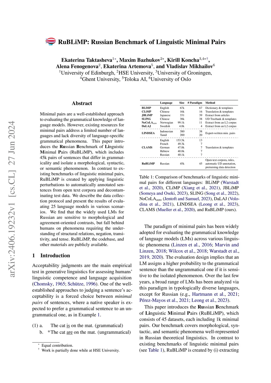 Minimal pairs are a well-established approach to evaluating the grammatical knowledge of language models. However, existing resources for minimal pairs address a limited number of languages and lack diversity of language-specific grammatical phenomena. This paper introduces the Russian Benchmark of Linguistic Minimal Pairs (RuBLiMP), which includes 45k pairs of sentences that differ in grammaticality and isolate a morphological, syntactic, or semantic phenomenon. In contrast to existing benchmarks of linguistic minimal pairs, RuBLiMP is created by applying linguistic perturbations to automatically annotated sentences from open text corpora and carefully curating test data. We describe the data collection protocol and present the results of evaluating 25 language models in various scenarios. We find that the widely used language models for Russian are sensitive to morphological and agreement-oriented contrasts but fall behind humans on phenomena requiring understanding of structural relations, negation, transitivity, and tense. RuBLiMP, the codebase, and other materials are publicly available.