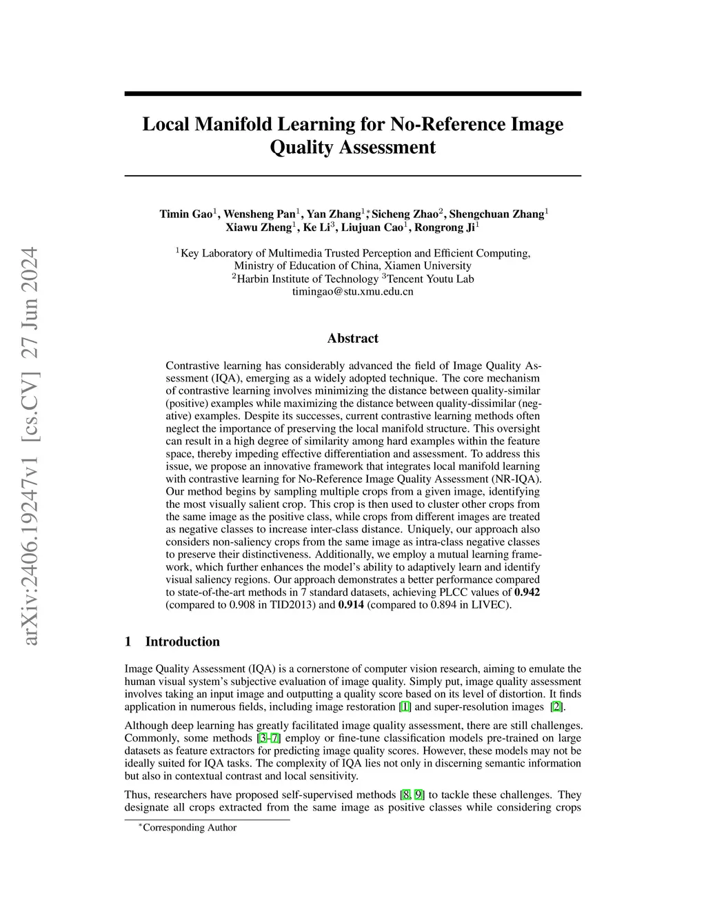 Contrastive Local Manifold Learning for No-Reference Image Quality Assessment