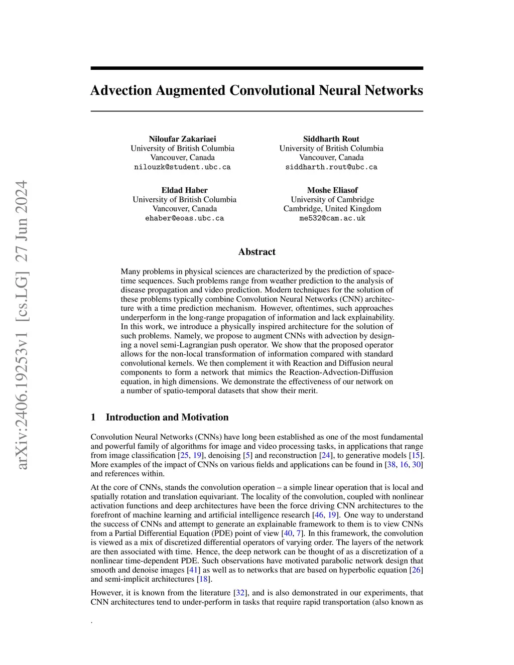 Many problems in physical sciences are characterized by the prediction of space-time sequences. Such problems range from weather prediction to the analysis of disease propagation and video prediction. Modern techniques for the solution of these problems typically combine Convolution Neural Networks (CNN) architecture with a time prediction mechanism. However, oftentimes, such approaches underperform in the long-range propagation of information and lack explainability. In this work, we introduce a physically inspired architecture for the solution of such problems. Namely, we propose to augment CNNs with advection by designing a novel semi-Lagrangian push operator. We show that the proposed operator allows for the non-local transformation of information compared with standard convolutional kernels. We then complement it with Reaction and Diffusion neural components to form a network that mimics the Reaction-Advection-Diffusion equation, in high dimensions. We demonstrate the effectiveness of our network on a number of spatio-temporal datasets that show their merit.