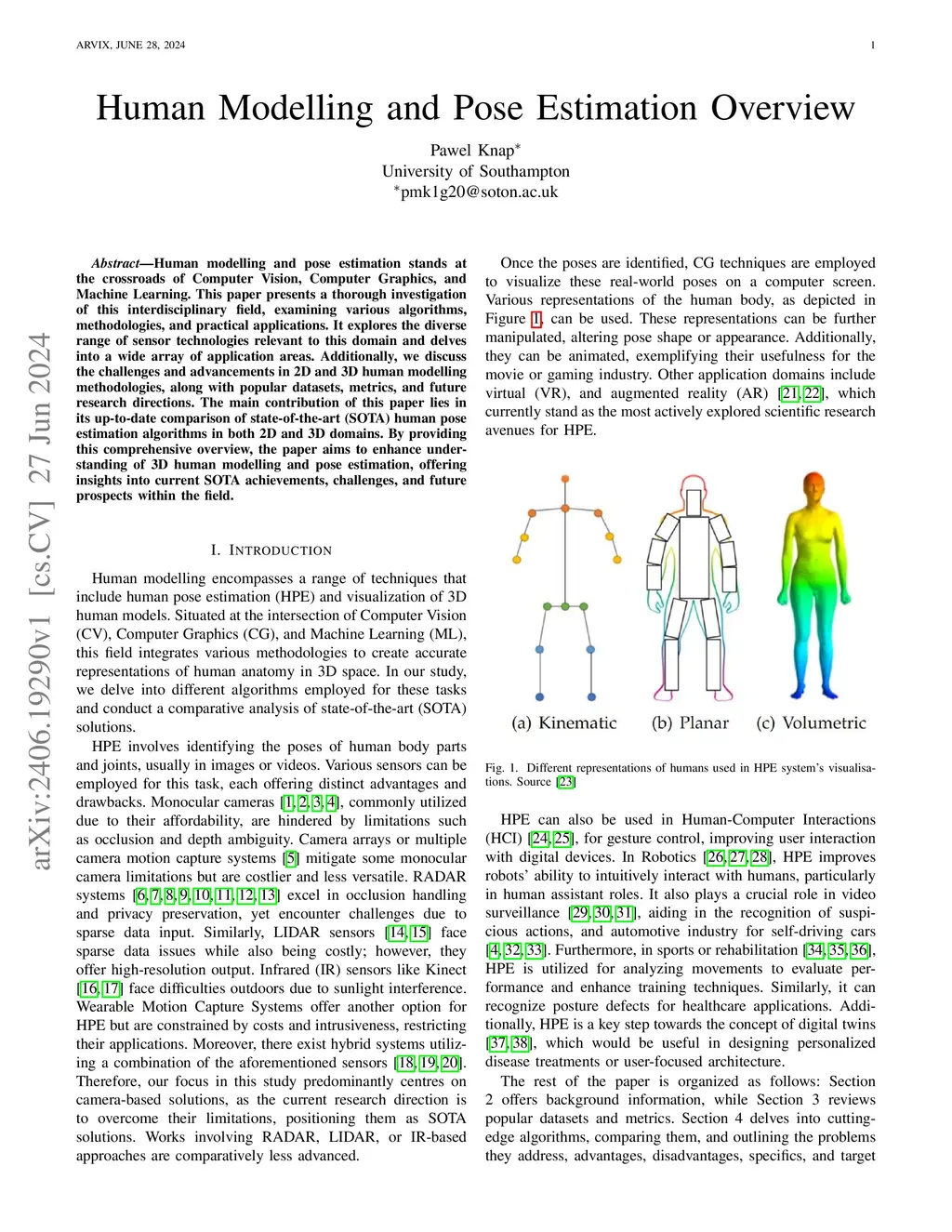 Human modelling and pose estimation stands at the crossroads of Computer Vision, Computer Graphics, and Machine Learning. This paper presents a thorough investigation of this interdisciplinary field, examining various algorithms, methodologies, and practical applications. It explores the diverse range of sensor technologies relevant to this domain and delves into a wide array of application areas. Additionally, we discuss the challenges and advancements in 2D and 3D human modelling methodologies, along with popular datasets, metrics, and future research directions. The main contribution of this paper lies in its up-to-date comparison of state-of-the-art (SOTA) human pose estimation algorithms in both 2D and 3D domains. By providing this comprehensive overview, the paper aims to enhance understanding of 3D human modelling and pose estimation, offering insights into current SOTA achievements, challenges, and future prospects within the field.
