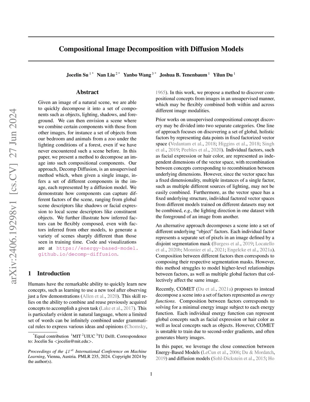 Given an image of a natural scene, we are able to quickly decompose it into a set of components such as objects, lighting, shadows, and foreground. We can then envision a scene where we combine certain components with those from other images, for instance a set of objects from our bedroom and animals from a zoo under the lighting conditions of a forest, even if we have never encountered such a scene before. In this paper, we present a method to decompose an image into such compositional components. Our approach, Decomp Diffusion, is an unsupervised method which, when given a single image, infers a set of different components in the image, each represented by a diffusion model. We demonstrate how components can capture different factors of the scene, ranging from global scene descriptors like shadows or facial expression to local scene descriptors like constituent objects. We further illustrate how inferred factors can be flexibly composed, even with factors inferred from other models, to generate a variety of scenes sharply different than those seen in training time. Website and code at https://energy-based-model.github.io/decomp-diffusion.