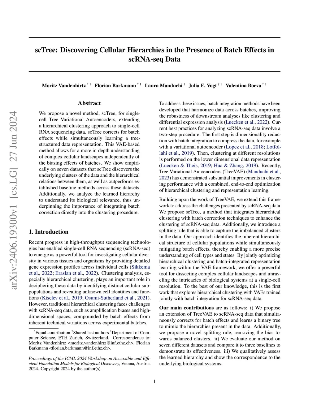 We propose a novel method, scTree, for single-cell Tree Variational Autoencoders, extending a hierarchical clustering approach to single-cell RNA sequencing data. scTree corrects for batch effects while simultaneously learning a tree-structured data representation. This VAE-based method allows for a more in-depth understanding of complex cellular landscapes independently of the biasing effects of batches. We show empirically on seven datasets that scTree discovers the underlying clusters of the data and the hierarchical relations between them, as well as outperforms established baseline methods across these datasets. Additionally, we analyze the learned hierarchy to understand its biological relevance, thus underpinning the importance of integrating batch correction directly into the clustering procedure.