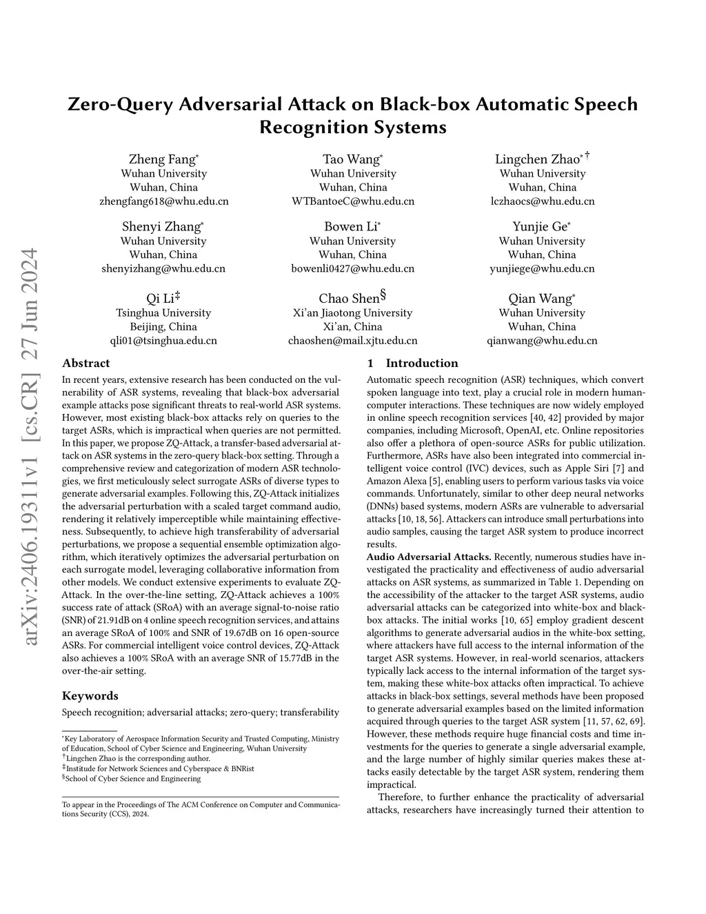 In recent years, extensive research has been conducted on the vulnerability of ASR systems, revealing that black-box adversarial example attacks pose significant threats to real-world ASR systems. However, most existing black-box attacks rely on queries to the target ASRs, which is impractical when queries are not permitted. In this paper, we propose ZQ-Attack, a transfer-based adversarial attack on ASR systems in the zero-query black-box setting. Through a comprehensive review and categorization of modern ASR technologies, we first meticulously select surrogate ASRs of diverse types to generate adversarial examples. Following this, ZQ-Attack initializes the adversarial perturbation with a scaled target command audio, rendering it relatively imperceptible while maintaining effectiveness. Subsequently, to achieve high transferability of adversarial perturbations, we propose a sequential ensemble optimization algorithm, which iteratively optimizes the adversarial perturbation on each surrogate model, leveraging collaborative information from other models. We conduct extensive experiments to evaluate ZQ-Attack. In the over-the-line setting, ZQ-Attack achieves a 100% success rate of attack (SRoA) with an average signal-to-noise ratio (SNR) of 21.91dB on 4 online speech recognition services, and attains an average SRoA of 100% and SNR of 19.67dB on 16 open-source ASRs. For commercial intelligent voice control devices, ZQ-Attack also achieves a 100% SRoA with an average SNR of 15.77dB in the over-the-air setting.