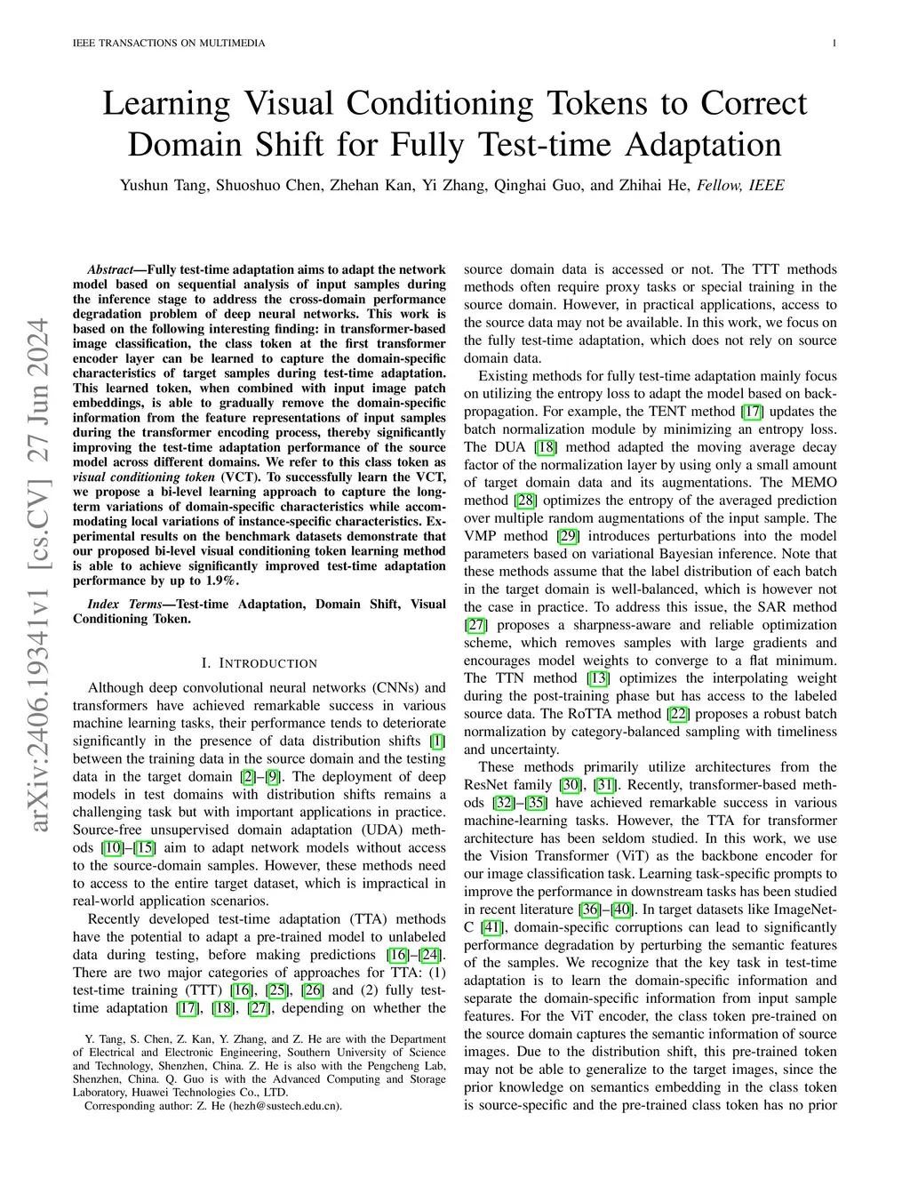 Fully test-time adaptation aims to adapt the network model based on sequential analysis of input samples during the inference stage to address the cross-domain performance degradation problem of deep neural networks. This work is based on the following interesting finding: in transformer-based image classification, the class token at the first transformer encoder layer can be learned to capture the domain-specific characteristics of target samples during test-time adaptation. This learned token, when combined with input image patch embeddings, is able to gradually remove the domain-specific information from the feature representations of input samples during the transformer encoding process, thereby significantly improving the test-time adaptation performance of the source model across different domains. We refer to this class token as visual conditioning token (VCT). To successfully learn the VCT, we propose a bi-level learning approach to capture the long-term variations of domain-specific characteristics while accommodating local variations of instance-specific characteristics. Experimental results on the benchmark datasets demonstrate that our proposed bi-level visual conditioning token learning method is able to achieve significantly improved test-time adaptation performance by up to 1.9%.