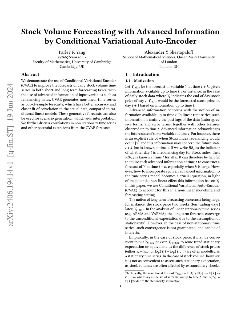 We demonstrate the use of Conditional Variational Encoder (CVAE) to improve the forecasts of daily stock volume time series in both short and long term forecasting tasks, with the use of advanced information of input variables such as rebalancing dates. CVAE generates non-linear time series as out-of-sample forecasts, which have better accuracy and closer fit of correlation to the actual data, compared to traditional linear models. These generative forecasts can also be used for scenario generation, which aids interpretation. We further discuss correlations in non-stationary time series and other potential extensions from the CVAE forecasts.
