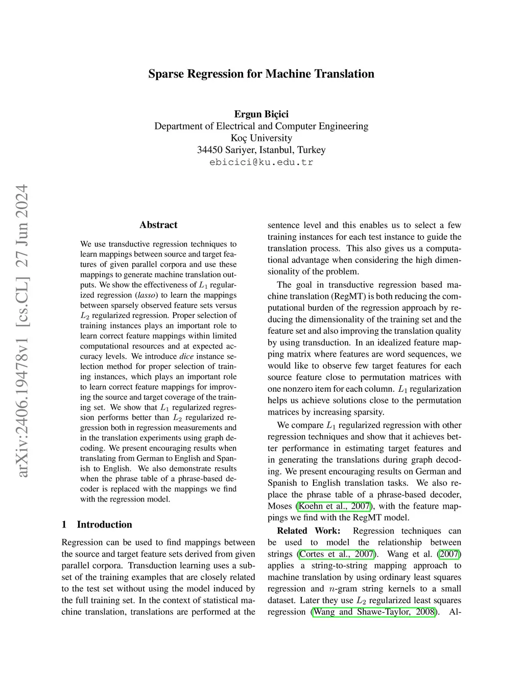 We use transductive regression techniques to learn mappings between source and target features of given parallel corpora and use these mappings to generate machine translation outputs. We show the effectiveness of regularized regression (\textit{lasso}) to learn the mappings between sparsely observed feature sets versus regularized regression. Proper selection of training instances plays an important role to learn correct feature mappings within limited computational resources and at expected accuracy levels. We introduce \textit{dice} instance selection method for proper selection of training instances, which plays an important role to learn correct feature mappings for improving the source and target coverage of the training set. We show that regularized regression performs better than regularized regression both in regression measurements and in the translation experiments using graph decoding. We present encouraging results when translating from German to English and Spanish to English. We also demonstrate results when the phrase table of a phrase-based decoder is replaced with the mappings we find with the regression model.