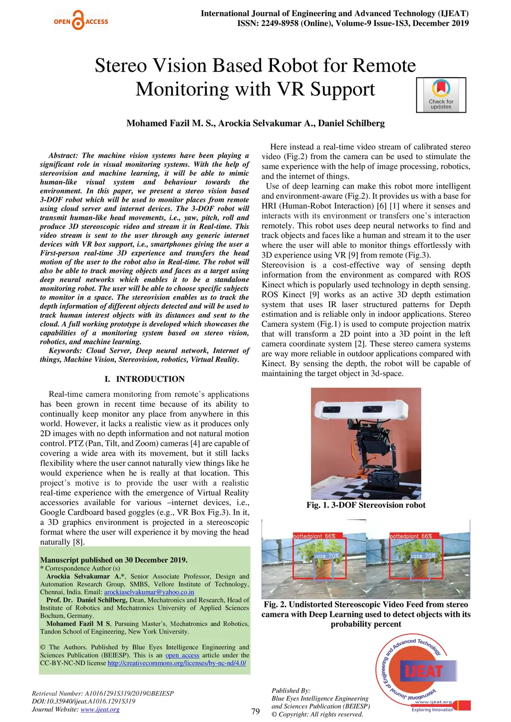 The machine vision systems have been playing a significant role in visual monitoring systems. With the help of stereovision and machine learning, it will be able to mimic human-like visual system and behaviour towards the environment. In this paper, we present a stereo vision based 3-DOF robot which will be used to monitor places from remote using cloud server and internet devices. The 3-DOF robot will transmit human-like head movements, i.e., yaw, pitch, roll and produce 3D stereoscopic video and stream it in Real-time. This video stream is sent to the user through any generic internet devices with VR box support, i.e., smartphones giving the user a First-person real-time 3D experience and transfers the head motion of the user to the robot also in Real-time. The robot will also be able to track moving objects and faces as a target using deep neural networks which enables it to be a standalone monitoring robot. The user will be able to choose specific subjects to monitor in a space. The stereovision enables us to track the depth information of different objects detected and will be used to track human interest objects with its distances and sent to the cloud. A full working prototype is developed which showcases the capabilities of a monitoring system based on stereo vision, robotics, and machine learning.