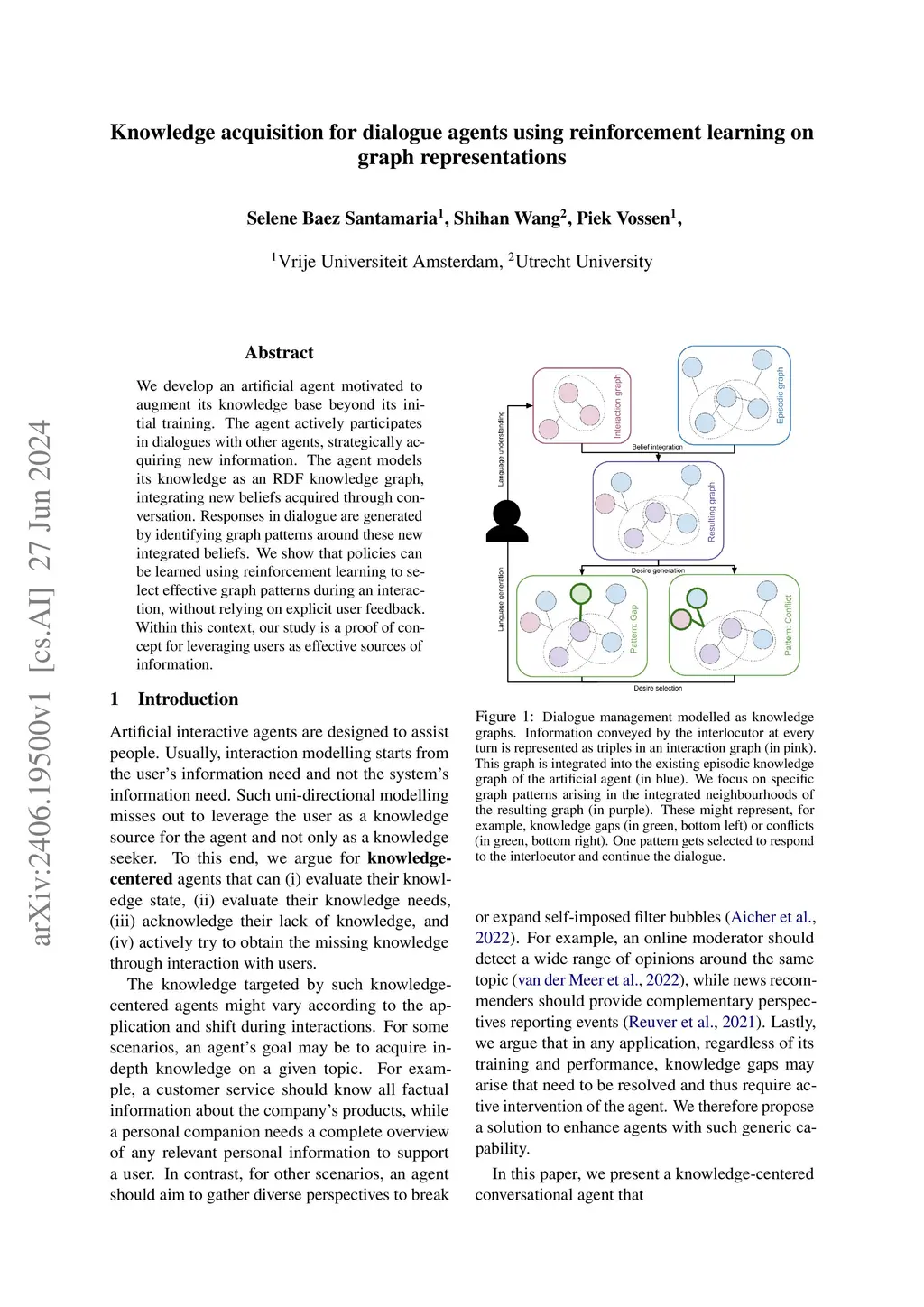 We develop an artificial agent motivated to augment its knowledge base beyond its initial training. The agent actively participates in dialogues with other agents, strategically acquiring new information. The agent models its knowledge as an RDF knowledge graph, integrating new beliefs acquired through conversation. Responses in dialogue are generated by identifying graph patterns around these new integrated beliefs. We show that policies can be learned using reinforcement learning to select effective graph patterns during an interaction, without relying on explicit user feedback. Within this context, our study is a proof of concept for leveraging users as effective sources of information.