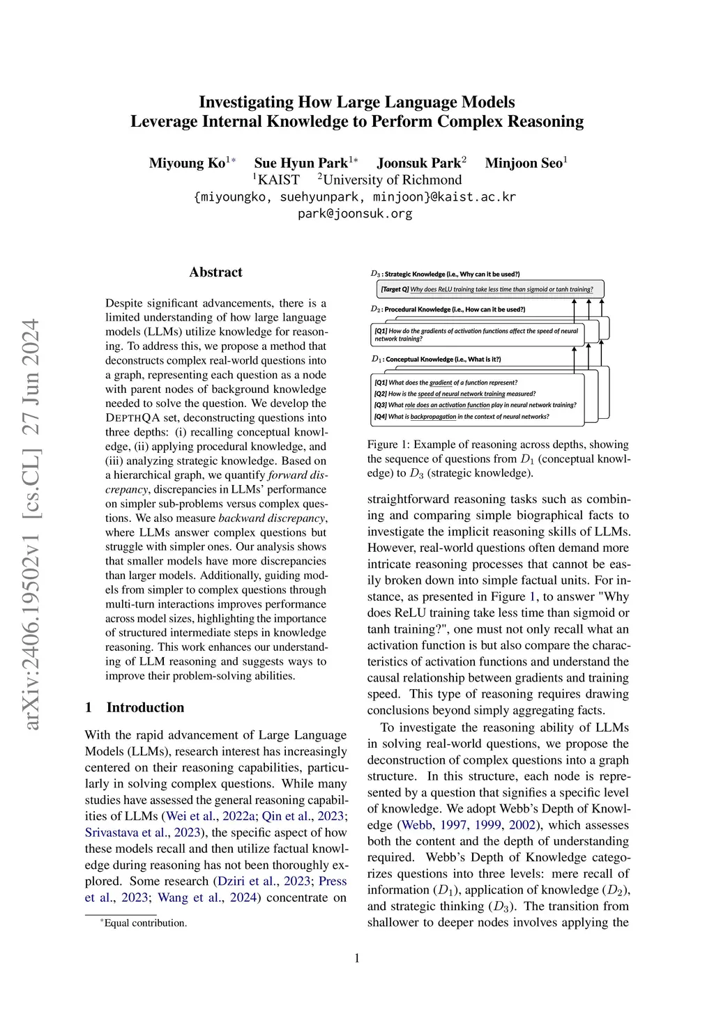 Despite significant advancements, there is a limited understanding of how large language models (LLMs) utilize knowledge for reasoning. To address this, we propose a method that deconstructs complex real-world questions into a graph, representing each question as a node with parent nodes of background knowledge needed to solve the question. We develop the DepthQA dataset, deconstructing questions into three depths: (i) recalling conceptual knowledge, (ii) applying procedural knowledge, and (iii) analyzing strategic knowledge. Based on a hierarchical graph, we quantify forward discrepancy, discrepancies in LLMs' performance on simpler sub-problems versus complex questions. We also measure backward discrepancy, where LLMs answer complex questions but struggle with simpler ones. Our analysis shows that smaller models have more discrepancies than larger models. Additionally, guiding models from simpler to complex questions through multi-turn interactions improves performance across model sizes, highlighting the importance of structured intermediate steps in knowledge reasoning. This work enhances our understanding of LLM reasoning and suggests ways to improve their problem-solving abilities.