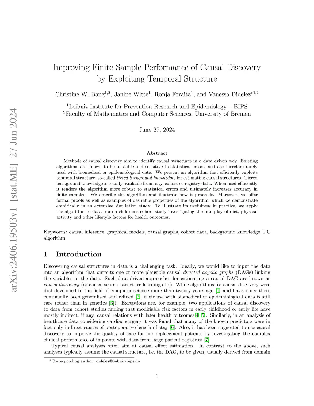 Methods of causal discovery aim to identify causal structures in a data driven way. Existing algorithms are known to be unstable and sensitive to statistical errors, and are therefore rarely used with biomedical or epidemiological data. We present an algorithm that efficiently exploits temporal structure, so-called tiered background knowledge, for estimating causal structures. Tiered background knowledge is readily available from, e.g., cohort or registry data. When used efficiently it renders the algorithm more robust to statistical errors and ultimately increases accuracy in finite samples. We describe the algorithm and illustrate how it proceeds. Moreover, we offer formal proofs as well as examples of desirable properties of the algorithm, which we demonstrate empirically in an extensive simulation study. To illustrate its usefulness in practice, we apply the algorithm to data from a children's cohort study investigating the interplay of diet, physical activity and other lifestyle factors for health outcomes.