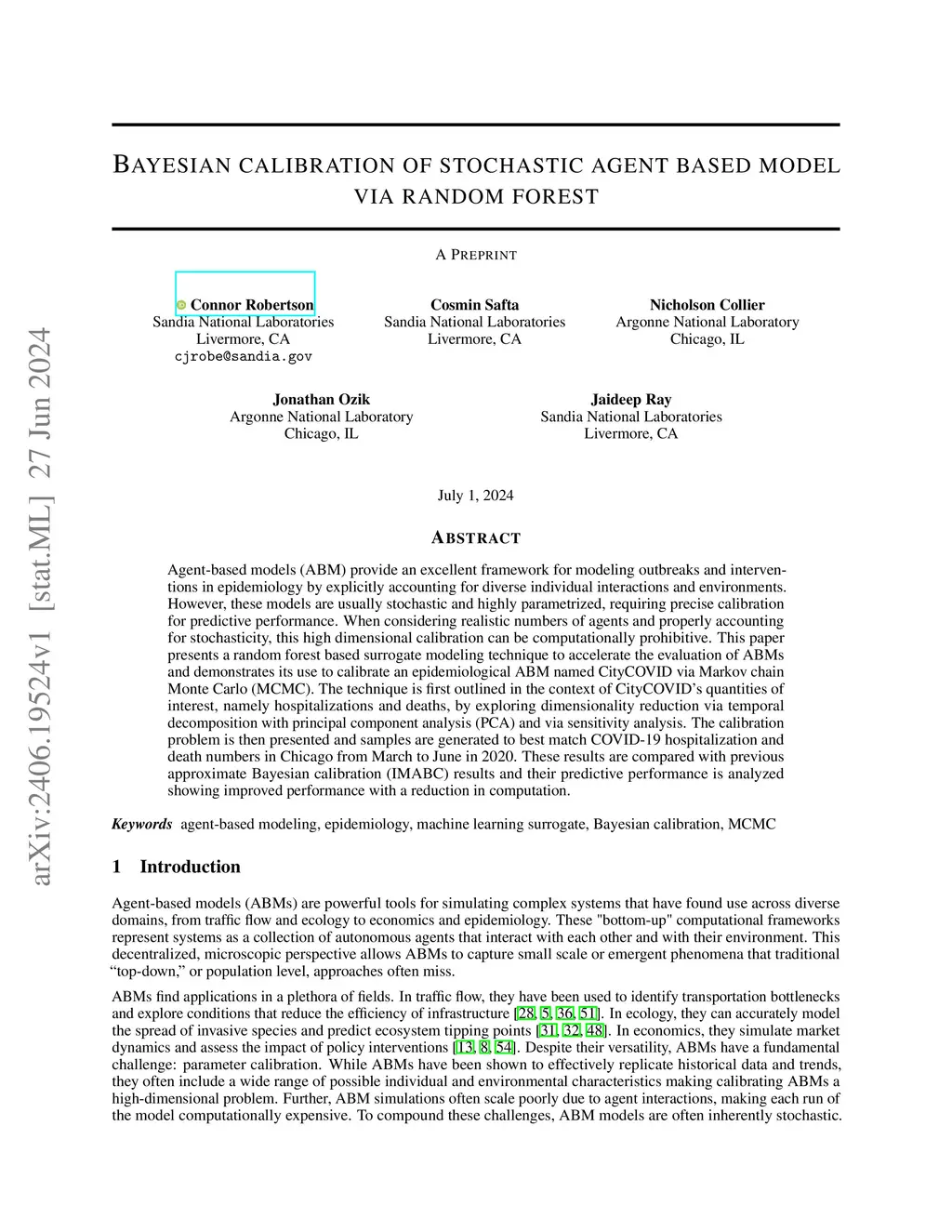 Bayesian calibration of stochastic agent based model via random forest