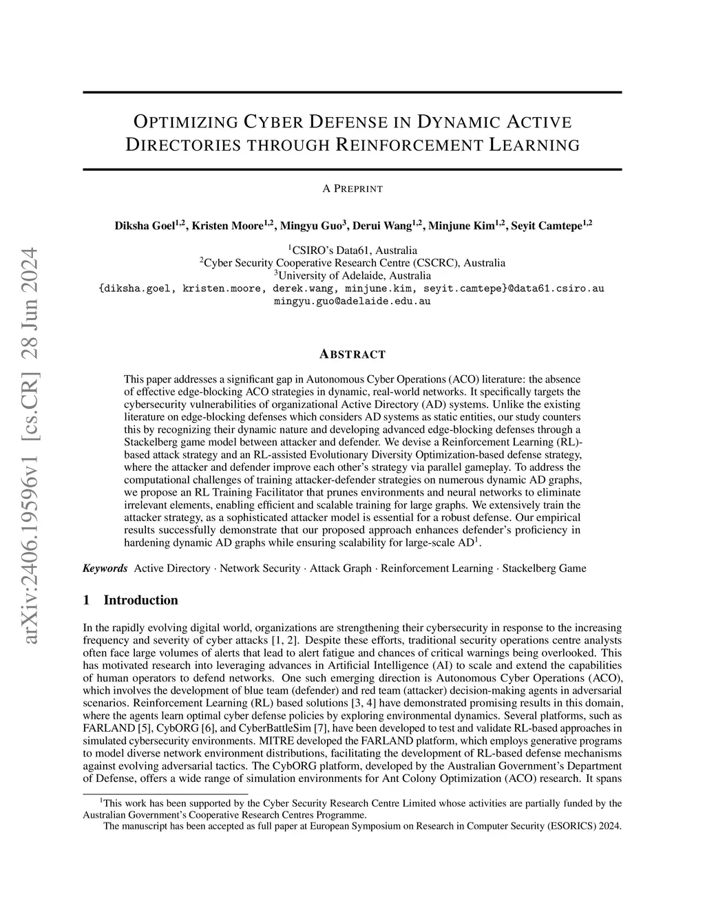 This paper addresses a significant gap in Autonomous Cyber Operations (ACO) literature: the absence of effective edge-blocking ACO strategies in dynamic, real-world networks. It specifically targets the cybersecurity vulnerabilities of organizational Active Directory (AD) systems. Unlike the existing literature on edge-blocking defenses which considers AD systems as static entities, our study counters this by recognizing their dynamic nature and developing advanced edge-blocking defenses through a Stackelberg game model between attacker and defender. We devise a Reinforcement Learning (RL)-based attack strategy and an RL-assisted Evolutionary Diversity Optimization-based defense strategy, where the attacker and defender improve each other strategy via parallel gameplay. To address the computational challenges of training attacker-defender strategies on numerous dynamic AD graphs, we propose an RL Training Facilitator that prunes environments and neural networks to eliminate irrelevant elements, enabling efficient and scalable training for large graphs. We extensively train the attacker strategy, as a sophisticated attacker model is essential for a robust defense. Our empirical results successfully demonstrate that our proposed approach enhances defender's proficiency in hardening dynamic AD graphs while ensuring scalability for large-scale AD.