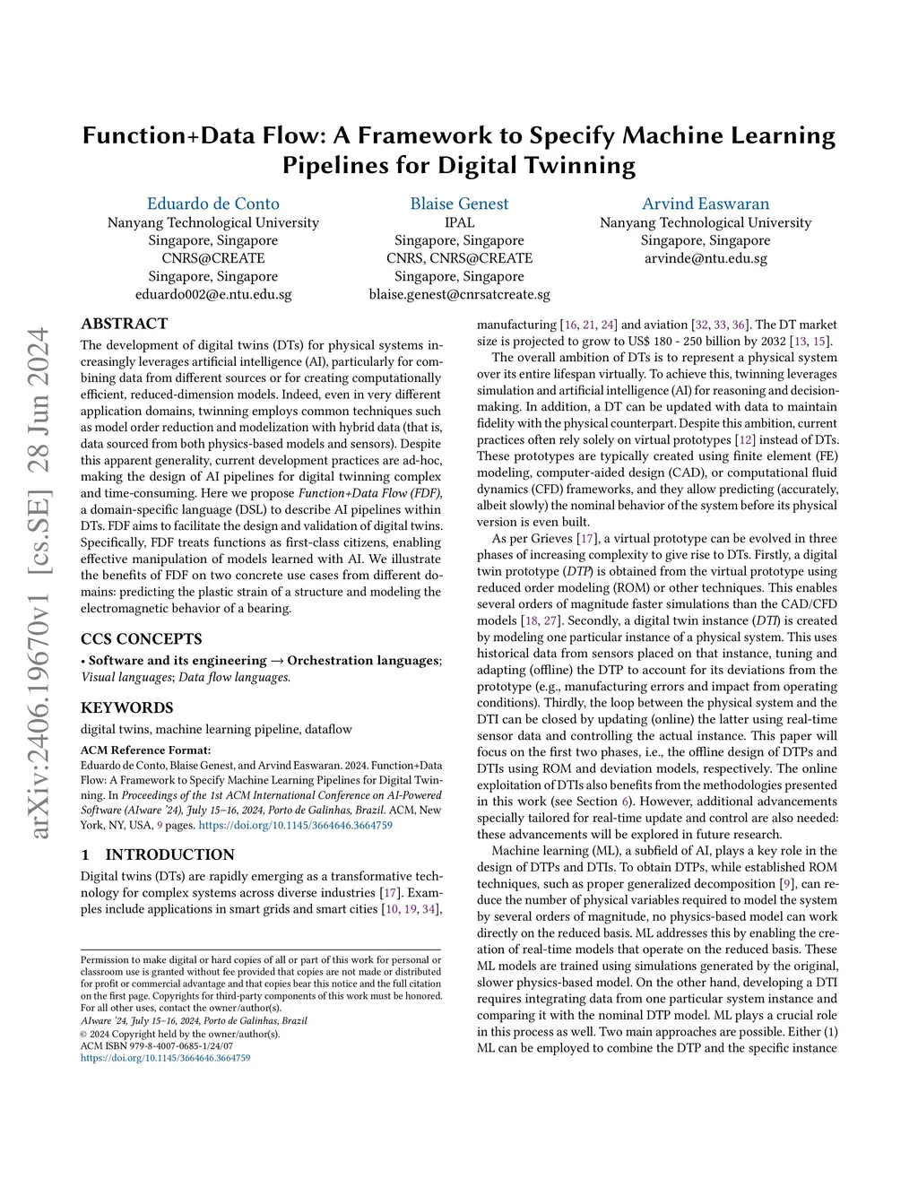 The development of digital twins (DTs) for physical systems increasingly leverages artificial intelligence (AI), particularly for combining data from different sources or for creating computationally efficient, reduced-dimension models. Indeed, even in very different application domains, twinning employs common techniques such as model order reduction and modelization with hybrid data (that is, data sourced from both physics-based models and sensors). Despite this apparent generality, current development practices are ad-hoc, making the design of AI pipelines for digital twinning complex and time-consuming. Here we propose Function+Data Flow (FDF), a domain-specific language (DSL) to describe AI pipelines within DTs. FDF aims to facilitate the design and validation of digital twins. Specifically, FDF treats functions as first-class citizens, enabling effective manipulation of models learned with AI. We illustrate the benefits of FDF on two concrete use cases from different domains: predicting the plastic strain of a structure and modeling the electromagnetic behavior of a bearing.