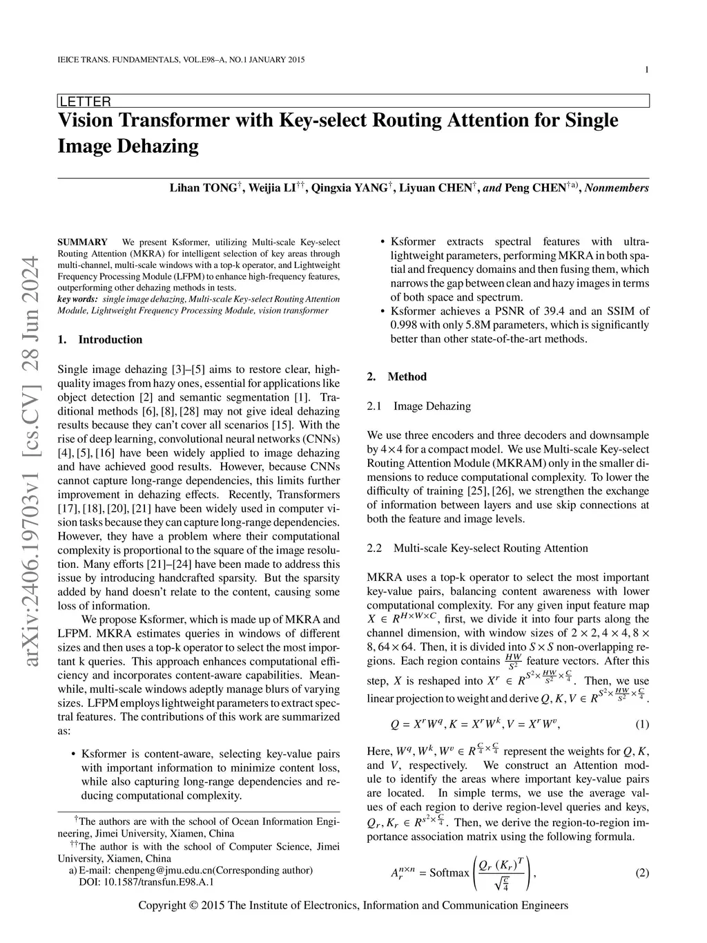 We present Ksformer, utilizing Multi-scale Key-select Routing Attention (MKRA) for intelligent selection of key areas through multi-channel, multi-scale windows with a top-k operator, and Lightweight Frequency Processing Module (LFPM) to enhance high-frequency features, outperforming other dehazing methods in tests.