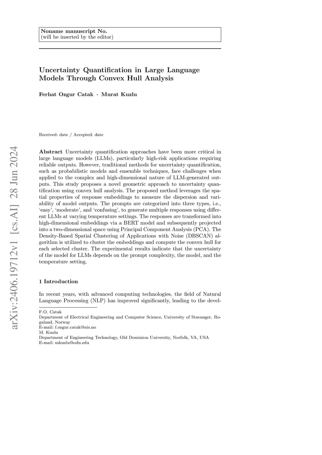 Uncertainty quantification approaches have been more critical in large language models (LLMs), particularly high-risk applications requiring reliable outputs. However, traditional methods for uncertainty quantification, such as probabilistic models and ensemble techniques, face challenges when applied to the complex and high-dimensional nature of LLM-generated outputs. This study proposes a novel geometric approach to uncertainty quantification using convex hull analysis. The proposed method leverages the spatial properties of response embeddings to measure the dispersion and variability of model outputs. The prompts are categorized into three types, i.e., `easy', `moderate', and `confusing', to generate multiple responses using different LLMs at varying temperature settings. The responses are transformed into high-dimensional embeddings via a BERT model and subsequently projected into a two-dimensional space using Principal Component Analysis (PCA). The Density-Based Spatial Clustering of Applications with Noise (DBSCAN) algorithm is utilized to cluster the embeddings and compute the convex hull for each selected cluster. The experimental results indicate that the uncertainty of the model for LLMs depends on the prompt complexity, the model, and the temperature setting.