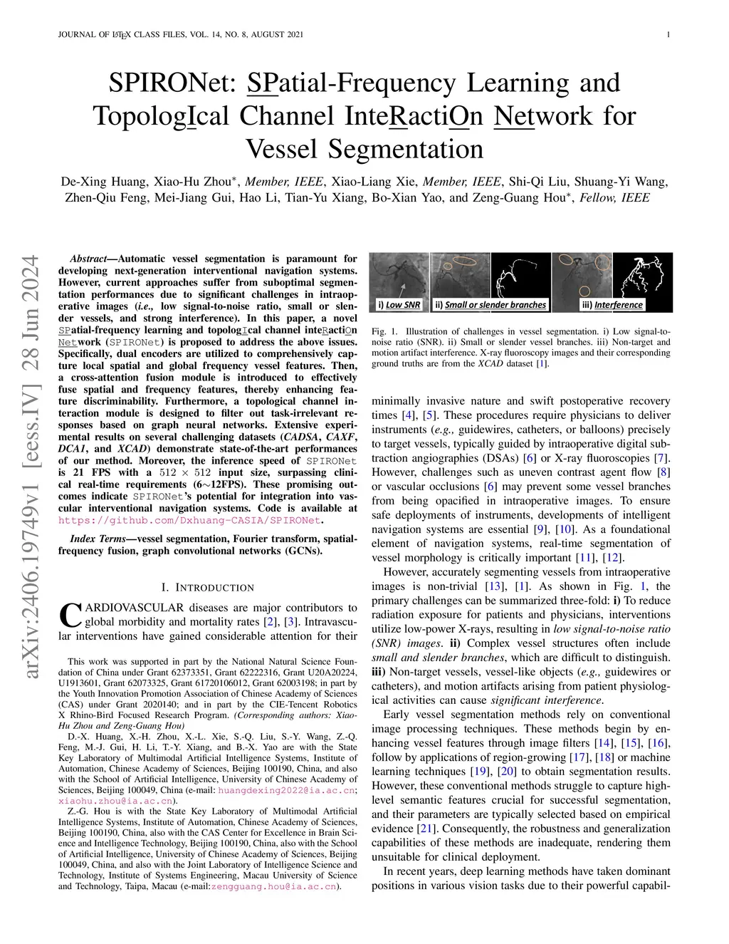 Automatic vessel segmentation is paramount for developing next-generation interventional navigation systems. However, current approaches suffer from suboptimal segmentation performances due to significant challenges in intraoperative images (i.e., low signal-to-noise ratio, small or slender vessels, and strong interference). In this paper, a novel spatial-frequency learning and topological channel interaction network (SPIRONet) is proposed to address the above issues. Specifically, dual encoders are utilized to comprehensively capture local spatial and global frequency vessel features. Then, a cross-attention fusion module is introduced to effectively fuse spatial and frequency features, thereby enhancing feature discriminability. Furthermore, a topological channel interaction module is designed to filter out task-irrelevant responses based on graph neural networks. Extensive experimental results on several challenging datasets (CADSA, CAXF, DCA1, and XCAD) demonstrate state-of-the-art performances of our method. Moreover, the inference speed of SPIRONet is 21 FPS with a 512x512 input size, surpassing clinical real-time requirements (6~12FPS). These promising outcomes indicate SPIRONet's potential for integration into vascular interventional navigation systems. Code is available at https://github.com/Dxhuang-CASIA/SPIRONet.