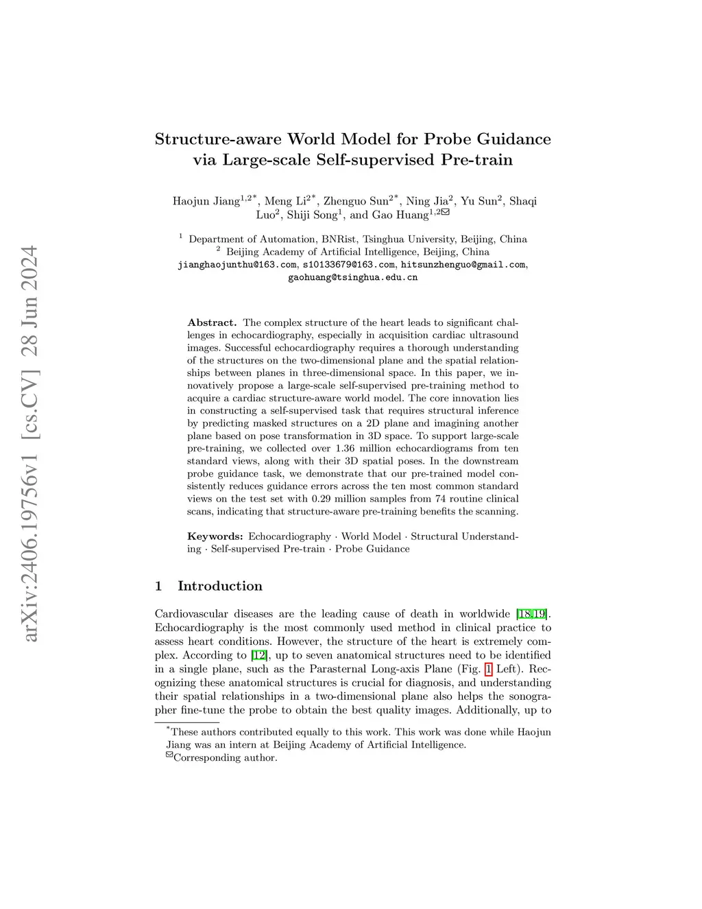 The complex structure of the heart leads to significant challenges in echocardiography, especially in acquisition cardiac ultrasound images. Successful echocardiography requires a thorough understanding of the structures on the two-dimensional plane and the spatial relationships between planes in three-dimensional space. In this paper, we innovatively propose a large-scale self-supervised pre-training method to acquire a cardiac structure-aware world model. The core innovation lies in constructing a self-supervised task that requires structural inference by predicting masked structures on a 2D plane and imagining another plane based on pose transformation in 3D space. To support large-scale pre-training, we collected over 1.36 million echocardiograms from ten standard views, along with their 3D spatial poses. In the downstream probe guidance task, we demonstrate that our pre-trained model consistently reduces guidance errors across the ten most common standard views on the test set with 0.29 million samples from 74 routine clinical scans, indicating that structure-aware pre-training benefits the scanning.