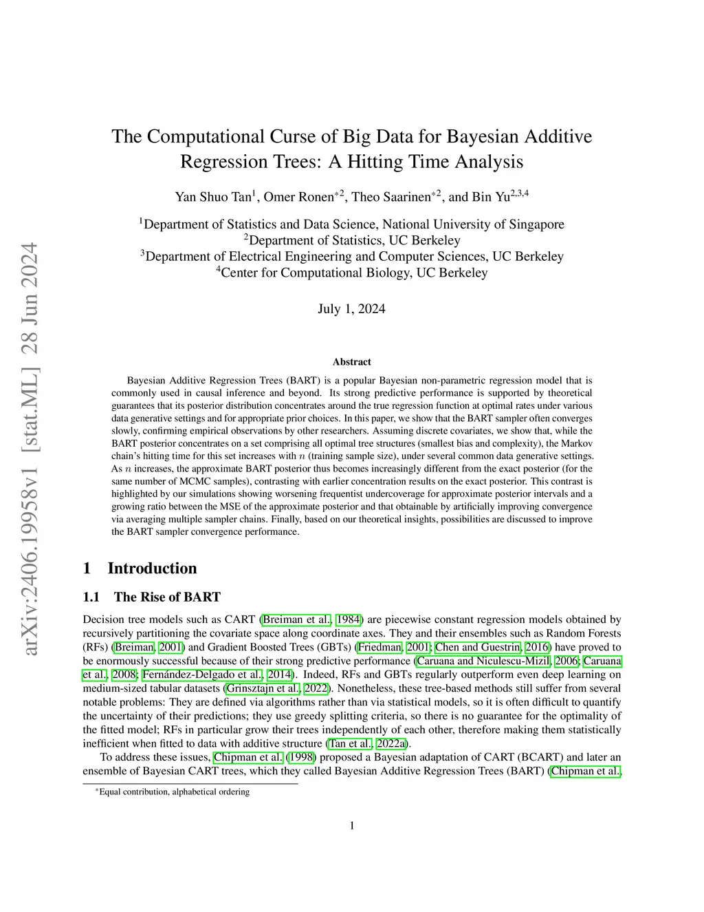Bayesian Additive Regression Trees (BART) is a popular Bayesian non-parametric regression model that is commonly used in causal inference and beyond. Its strong predictive performance is supported by well-developed estimation theory, comprising guarantees that its posterior distribution concentrates around the true regression function at optimal rates under various data generative settings and for appropriate prior choices. However, the computational properties of the widely-used BART sampler proposed by Chipman et al. (2010) are yet to be well-understood. In this paper, we perform an asymptotic analysis of a slightly modified version of the default BART sampler when fitted to data-generating processes with discrete covariates. We show that the sampler's time to convergence, evaluated in terms of the hitting time of a high posterior density set, increases with the number of training samples, due to the multi-modal nature of the target posterior. On the other hand, we show that this trend can be dampened by simple changes, such as increasing the number of trees in the ensemble or raising the temperature of the sampler. These results provide a nuanced picture on the computational efficiency of the BART sampler in the presence of large amounts of training data while suggesting strategies to improve the sampler. We complement our theoretical analysis with a simulation study focusing on the default BART sampler. We observe that the increasing trend of convergence time against number training samples holds for the default BART sampler and is robust to changes in sampler initialization, number of burn-in iterations, feature selection prior, and discretization strategy. On the other hand, increasing the number of trees or raising the temperature sharply dampens this trend, as indicated by our theory.