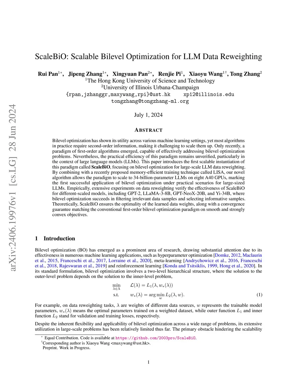 ScaleBiO: Scalable Bilevel Optimization for LLM Data Reweighting