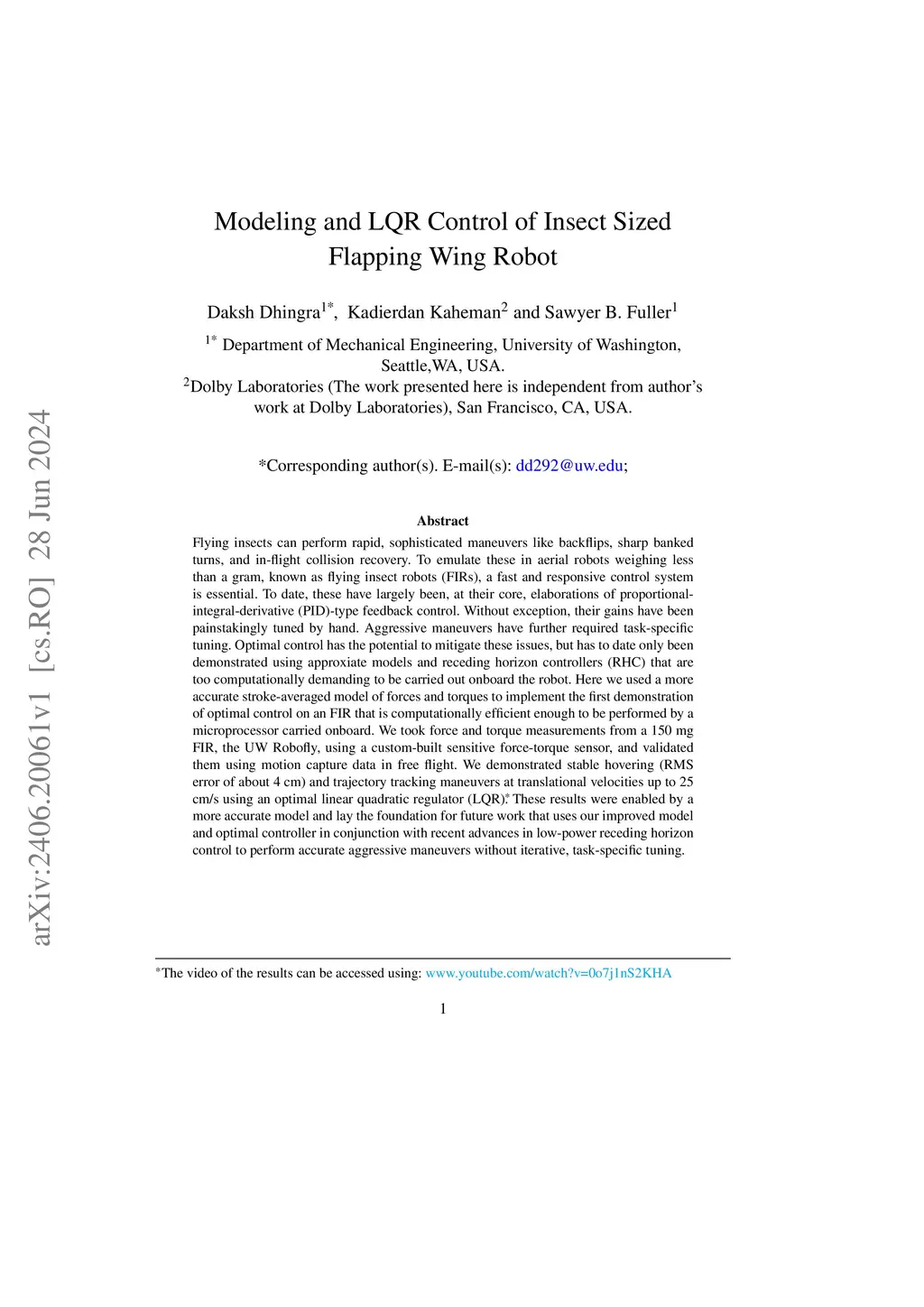 Modeling and LQR Control of Insect Sized Flapping Wing Robot