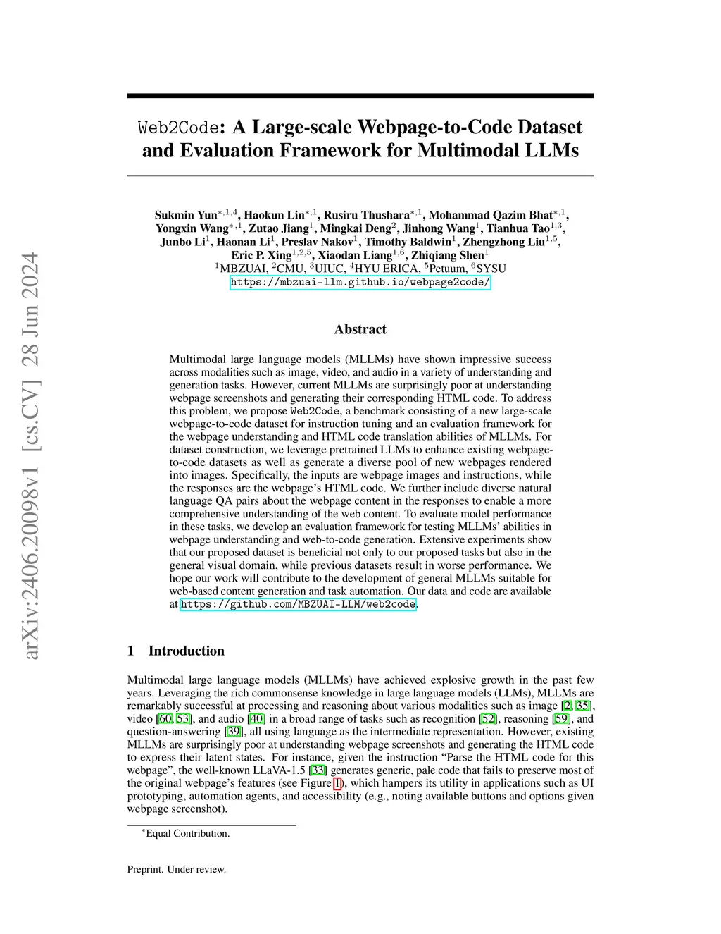 Multimodal large language models (MLLMs) have shown impressive success across modalities such as image, video, and audio in a variety of understanding and generation tasks. However, current MLLMs are surprisingly poor at understanding webpage screenshots and generating their corresponding HTML code. To address this problem, we propose Web2Code, a benchmark consisting of a new large-scale webpage-to-code dataset for instruction tuning and an evaluation framework for the webpage understanding and HTML code translation abilities of MLLMs. For dataset construction, we leverage pretrained LLMs to enhance existing webpage-to-code datasets as well as generate a diverse pool of new webpages rendered into images. Specifically, the inputs are webpage images and instructions, while the responses are the webpage's HTML code. We further include diverse natural language QA pairs about the webpage content in the responses to enable a more comprehensive understanding of the web content. To evaluate model performance in these tasks, we develop an evaluation framework for testing MLLMs' abilities in webpage understanding and web-to-code generation. Extensive experiments show that our proposed dataset is beneficial not only to our proposed tasks but also in the general visual domain, while previous datasets result in worse performance. We hope our work will contribute to the development of general MLLMs suitable for web-based content generation and task automation. Our data and code will be available at https://github.com/MBZUAI-LLM/web2code.