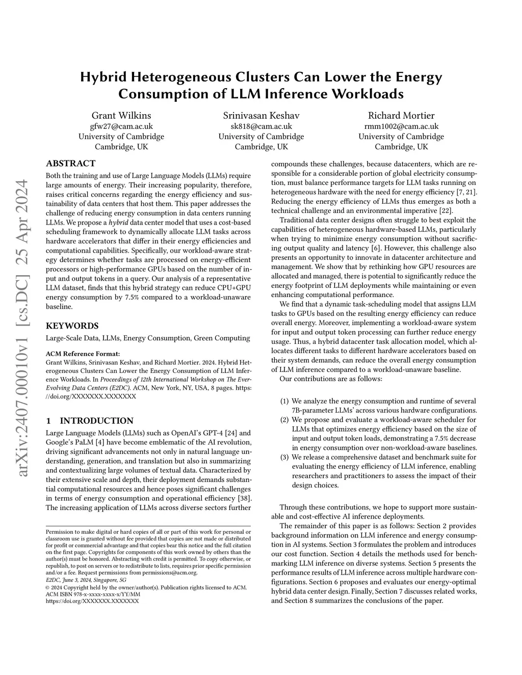 Both the training and use of Large Language Models (LLMs) require large amounts of energy. Their increasing popularity, therefore, raises critical concerns regarding the energy efficiency and sustainability of data centers that host them. This paper addresses the challenge of reducing energy consumption in data centers running LLMs. We propose a hybrid data center model that uses a cost-based scheduling framework to dynamically allocate LLM tasks across hardware accelerators that differ in their energy efficiencies and computational capabilities. Specifically, our workload-aware strategy determines whether tasks are processed on energy-efficient processors or high-performance GPUs based on the number of input and output tokens in a query. Our analysis of a representative LLM dataset, finds that this hybrid strategy can reduce CPU+GPU energy consumption by 7.5% compared to a workload-unaware baseline.