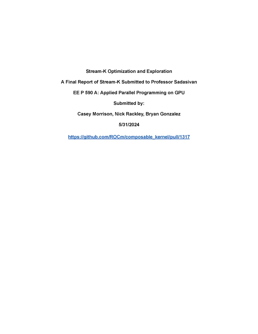 We explore optimization options for the Stream-K algorithm, a work-centric parallelization of matrix multiplication (GEMM). In our study, we investigated differences between the theoretical and practical implementations, particularly noting the impact of padding. Our debugging efforts revealed a persistent bug related to block mapping, which we could not fully resolve, but we managed to implement some optimizations. Setting the padding to zero for the M, N, and K dimensions resulted in an average 0.6% improvement in performance, achieving 1.44 ms, 89.37 TFlops, and 66.91 GB/s. However, adjusting the block size and parameters led to the process getting stuck, indicating a need for further tuning. Additionally, exploring the potential of Block2Time highlighted its promise in enhancing runtime predictions and optimizing load balancing.