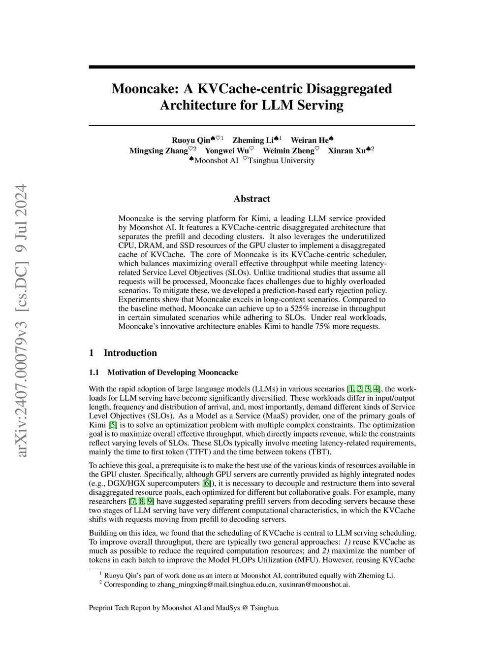 Mooncake is the serving platform for Kimi, a leading LLM service provided by Moonshot AI. It features a KVCache-centric disaggregated architecture that separates the prefill and decoding clusters. It also leverages the underutilized CPU, DRAM, and SSD resources of the GPU cluster to implement a disaggregated cache of KVCache. The core of Mooncake is its KVCache-centric scheduler, which balances maximizing overall effective throughput while meeting latency-related Service Level Objectives (SLOs). Unlike traditional studies that assume all requests will be processed, Mooncake faces challenges due to highly overloaded scenarios. To mitigate these, we developed a prediction-based early rejection policy. Experiments show that Mooncake excels in long-context scenarios. Compared to the baseline method, Mooncake can achieve up to a 525% increase in throughput in certain simulated scenarios while adhering to SLOs. Under real workloads, Mooncake's innovative architecture enables Kimi to handle 75% more requests.