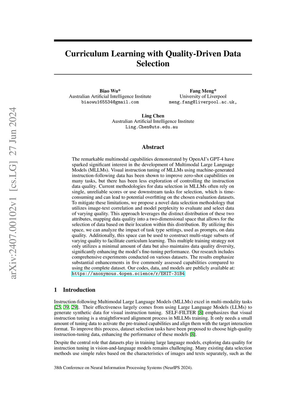 The impressive multimodal capabilities demonstrated by OpenAI's GPT-4 have generated significant interest in the development of Multimodal Large Language Models (MLLMs). Visual instruction tuning of MLLMs with machine-generated instruction-following data has shown to enhance zero-shot capabilities across various tasks. However, there has been limited exploration into controlling the quality of the instructionthis http URLmethodologies for data selection in MLLMs often rely on single, unreliable scores or use downstream tasks for selection, which is time-consuming and can lead to potential overfitting on the chosen evaluation datasets. To mitigate these limitations, we propose a novel data selection methodology that utilizes image-text correlation and model perplexity to evaluate and select data of varying quality. This approach leverages the distinct distribution of these two attributes, mapping data quality into a two-dimensional space that allows for the selection of data based on their location within this distribution. By utilizing this space, we can analyze the impact of task type settings, used as prompts, on data quality. Additionally, this space can be used to construct multi-stage subsets of varying quality to facilitate curriculum learning. Our research includes comprehensive experiments conducted on various datasets. The results emphasize substantial enhancements in five commonly assessed capabilities compared to using the complete dataset. Our codes, data, and models are publicly available at:this https URL