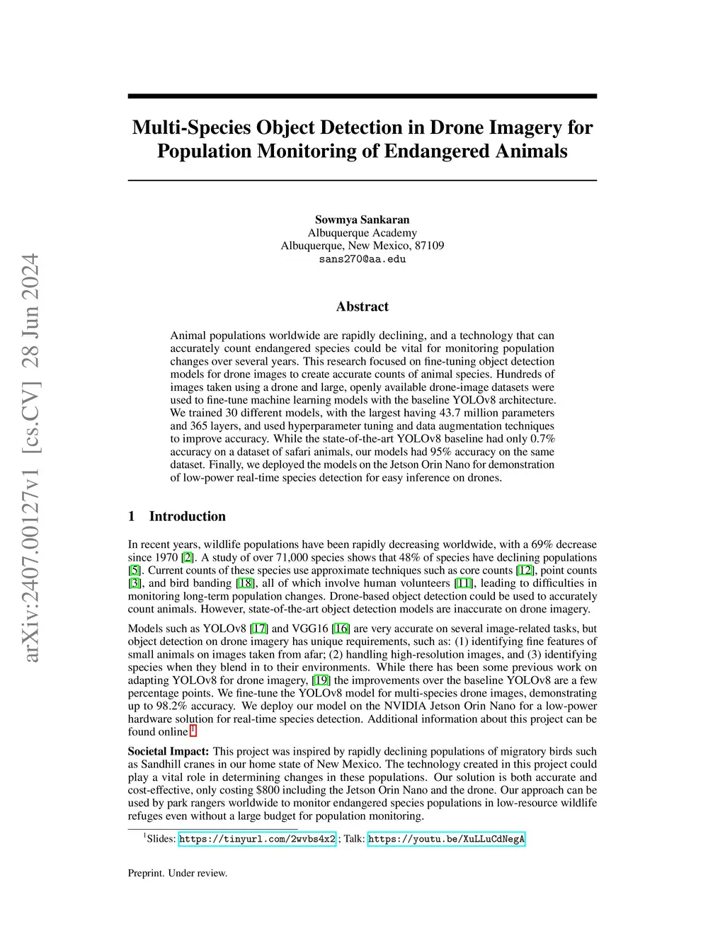 Animal populations worldwide are rapidly declining, and a technology that can accurately count endangered species could be vital for monitoring population changes over several years. This research focused on fine-tuning object detection models for drone images to create accurate counts of animal species. Hundreds of images taken using a drone and large, openly available drone-image datasets were used to fine-tune machine learning models with the baseline YOLOv8 architecture. We trained 30 different models, with the largest having 43.7 million parameters and 365 layers, and used hyperparameter tuning and data augmentation techniques to improve accuracy. While the state-of-the-art YOLOv8 baseline had only 0.7% accuracy on a dataset of safari animals, our models had 95% accuracy on the same dataset. Finally, we deployed the models on the Jetson Orin Nano for demonstration of low-power real-time species detection for easy inference on drones.