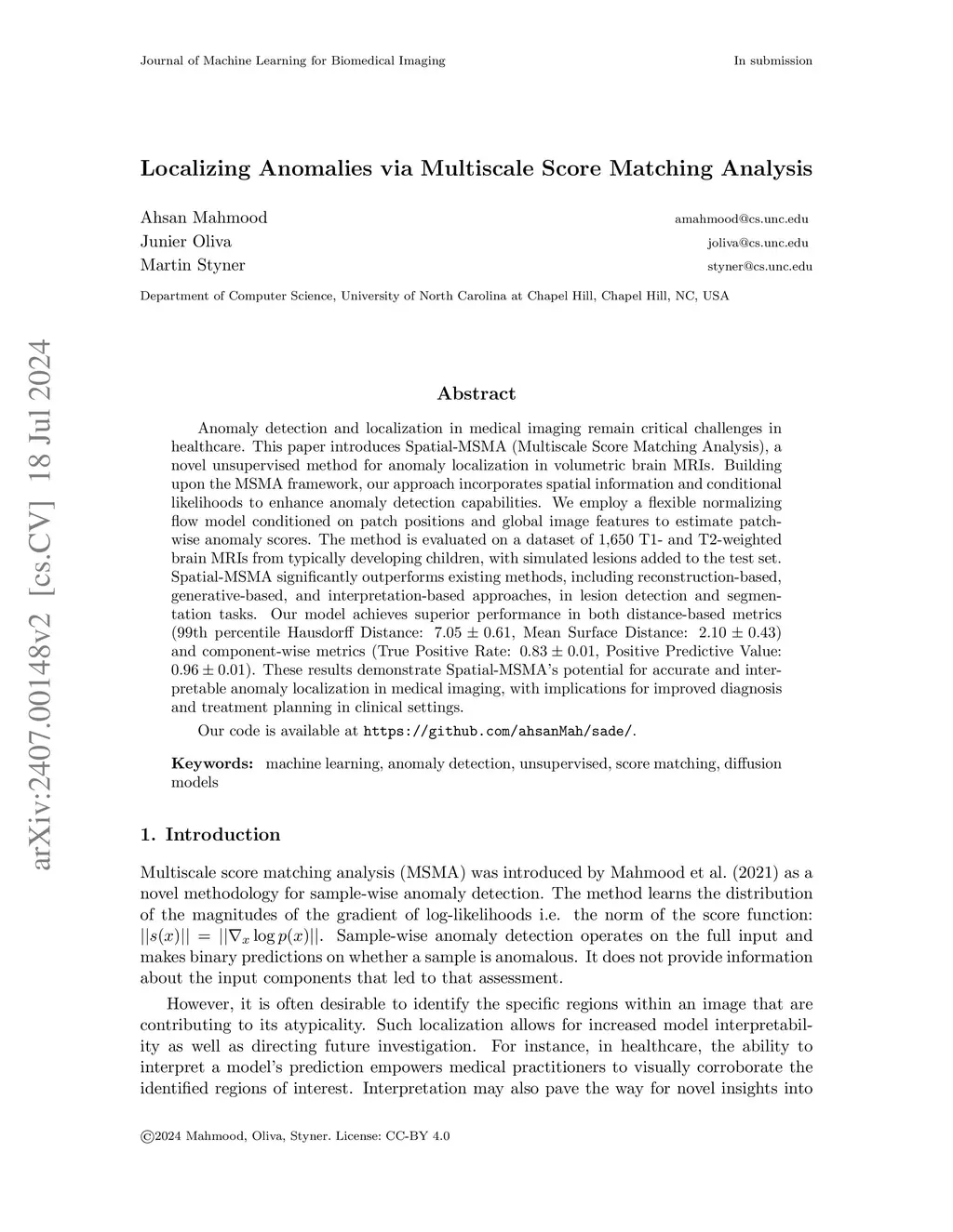 Anomaly detection and localization in medical imaging remain critical challenges in healthcare. This paper introduces Spatial-MSMA (Multiscale Score Matching Analysis), a novel unsupervised method for anomaly localization in volumetric brain MRIs. Building upon the MSMA framework, our approach incorporates spatial information and conditional likelihoods to enhance anomaly detection capabilities. We employ a flexible normalizing flow model conditioned on patch positions and global image features to estimate patch-wise anomaly scores. The method is evaluated on a dataset of 1,650 T1- and T2-weighted brain MRIs from typically developing children, with simulated lesions added to the test set. Spatial-MSMA significantly outperforms existing methods, including reconstruction-based, generative-based, and interpretation-based approaches, in lesion detection and segmentation tasks. Our model achieves superior performance in both distance-based metrics (99th percentile Hausdorff Distance: , Mean Surface Distance: ) and component-wise metrics (True Positive Rate: , Positive Predictive Value: ). These results demonstrate Spatial-MSMA's potential for accurate and interpretable anomaly localization in medical imaging, with implications for improved diagnosis and treatment planning in clinical settings. Our code is available at~\url{https://github.com/ahsanMah/sade/}.
