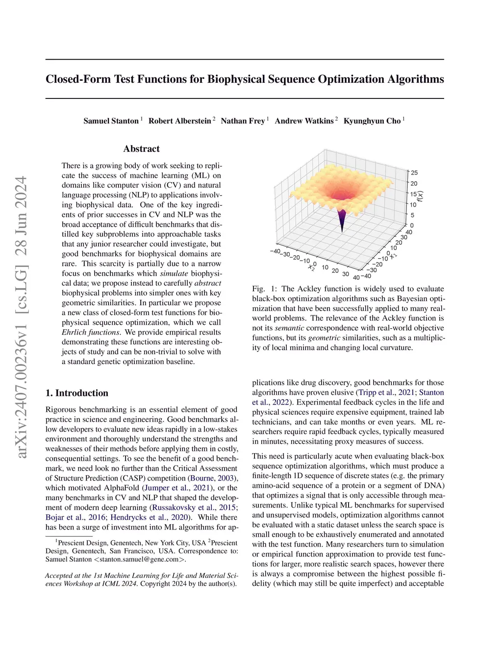 There is a growing body of work seeking to replicate the success of machine learning (ML) on domains like computer vision (CV) and natural language processing (NLP) to applications involving biophysical data. One of the key ingredients of prior successes in CV and NLP was the broad acceptance of difficult benchmarks that distilled key subproblems into approachable tasks that any junior researcher could investigate, but good benchmarks for biophysical domains are rare. This scarcity is partially due to a narrow focus on benchmarks which simulate biophysical data; we propose instead to carefully abstract biophysical problems into simpler ones with key geometric similarities. In particular we propose a new class of closed-form test functions for biophysical sequence optimization, which we call Ehrlich functions. We provide empirical results demonstrating these functions are interesting objects of study and can be non-trivial to solve with a standard genetic optimization baseline.